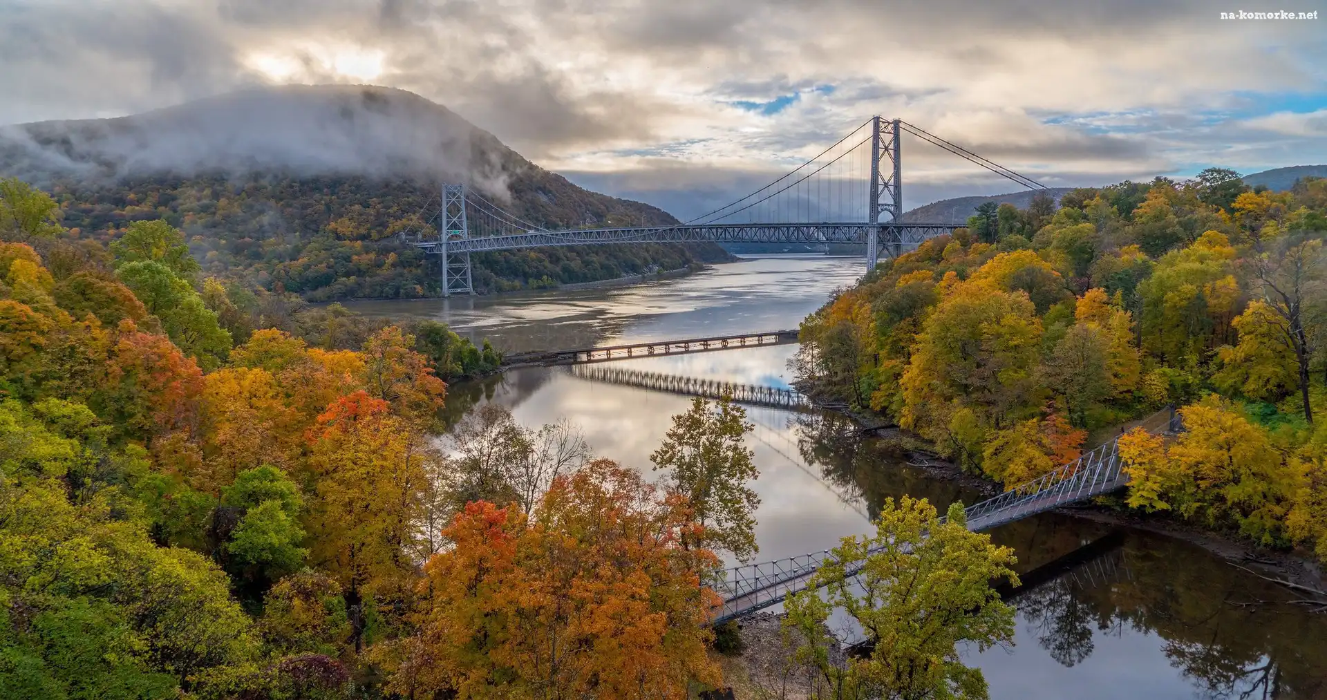 Jesień, Nowy Jork, Rzeka Hudson River, Stany Zjednoczone, Drzewa, Most Bear Mountain Bridge, Purple Heart Veterans Memorial Bridge, Góry na Komórkę |