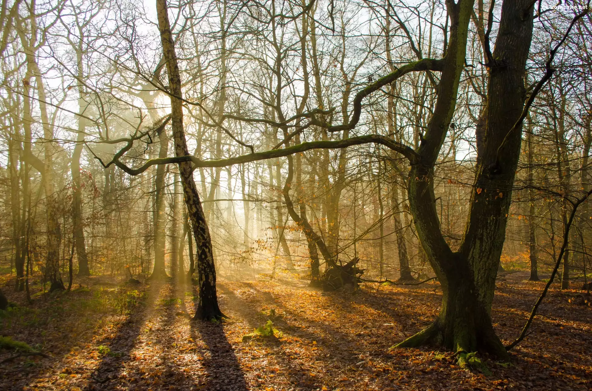 Jesień, Mgła, Przebijające światło, Las na Komórkę