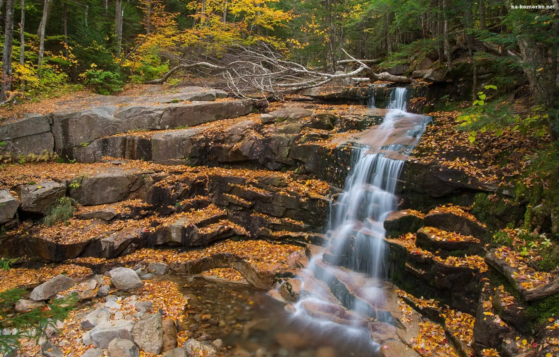 Jesień, Liście, Wodospad, Kamienie na Komórkę