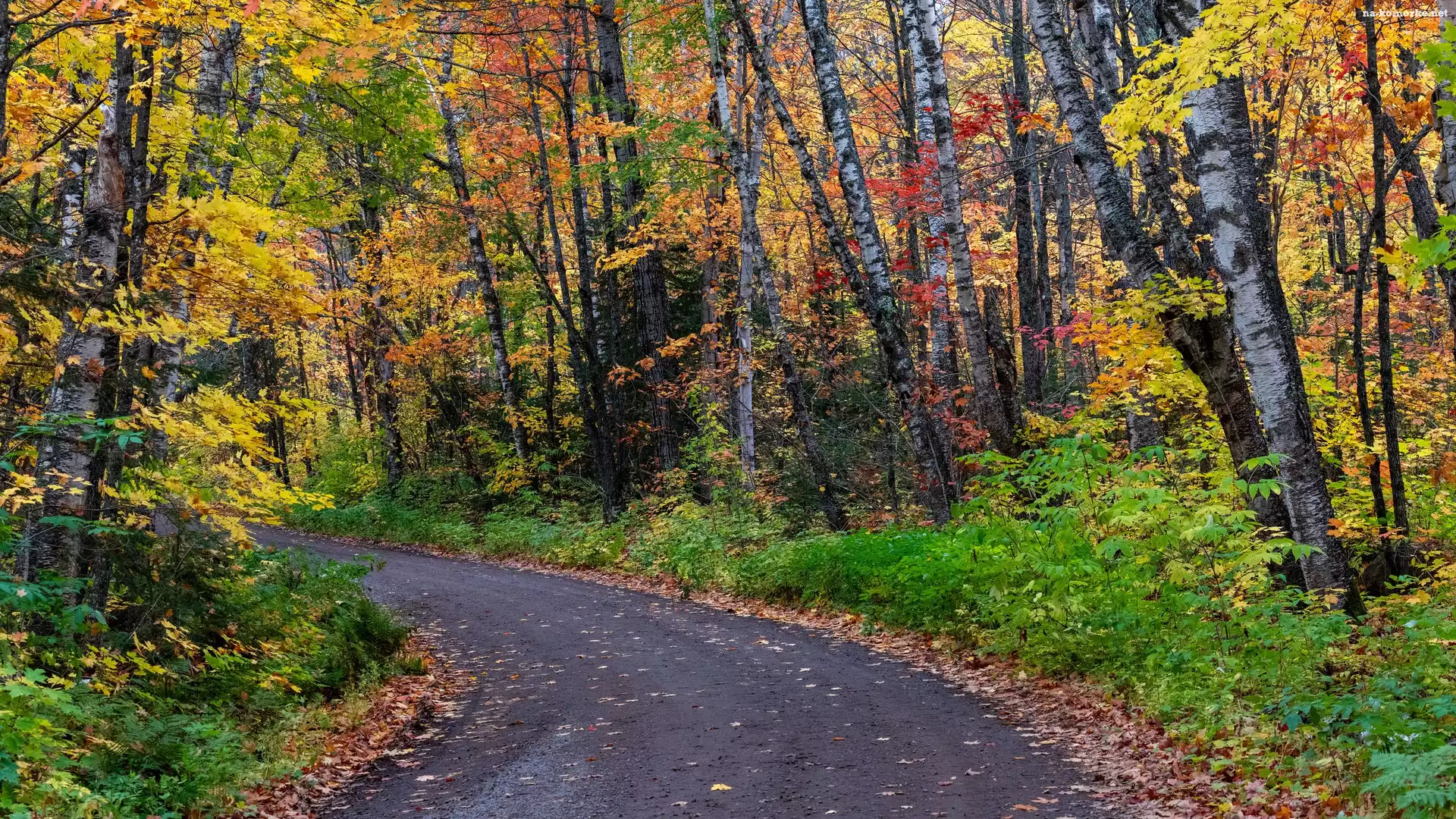 Las, Droga, Drzewa, Jesień, Kolorowe, Zakręt na Komórkę