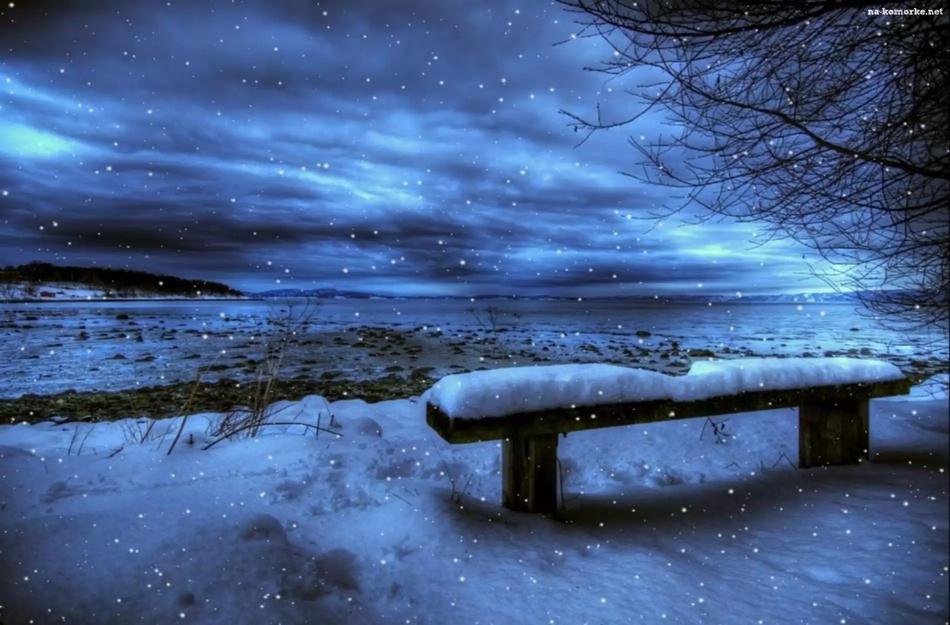 Jeziorem, Niebo, Zima, Ławka, Nad na Komórkę