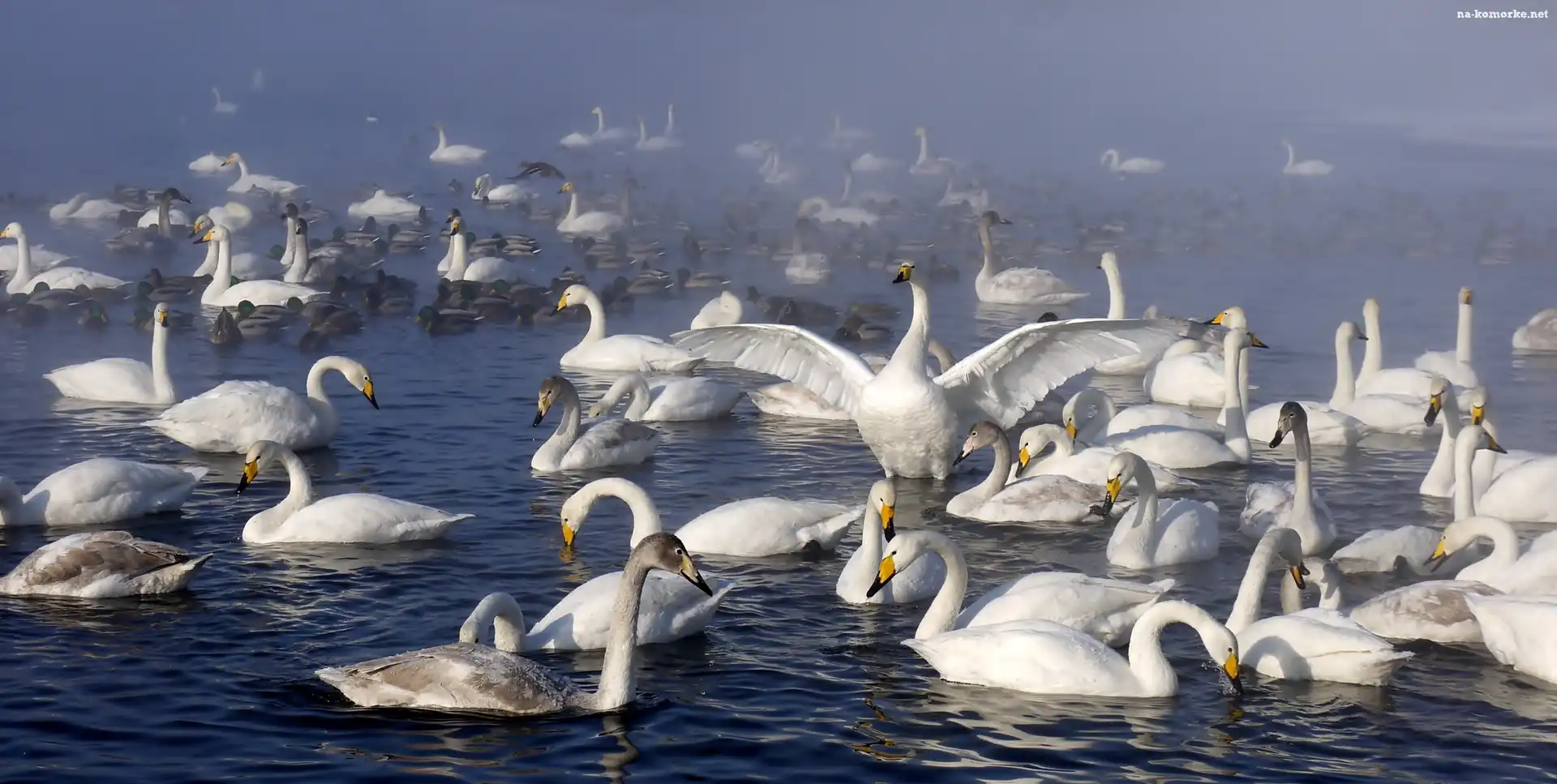 Jezioro, Mgła, Łabędzie, Kaczki na Komórkę
