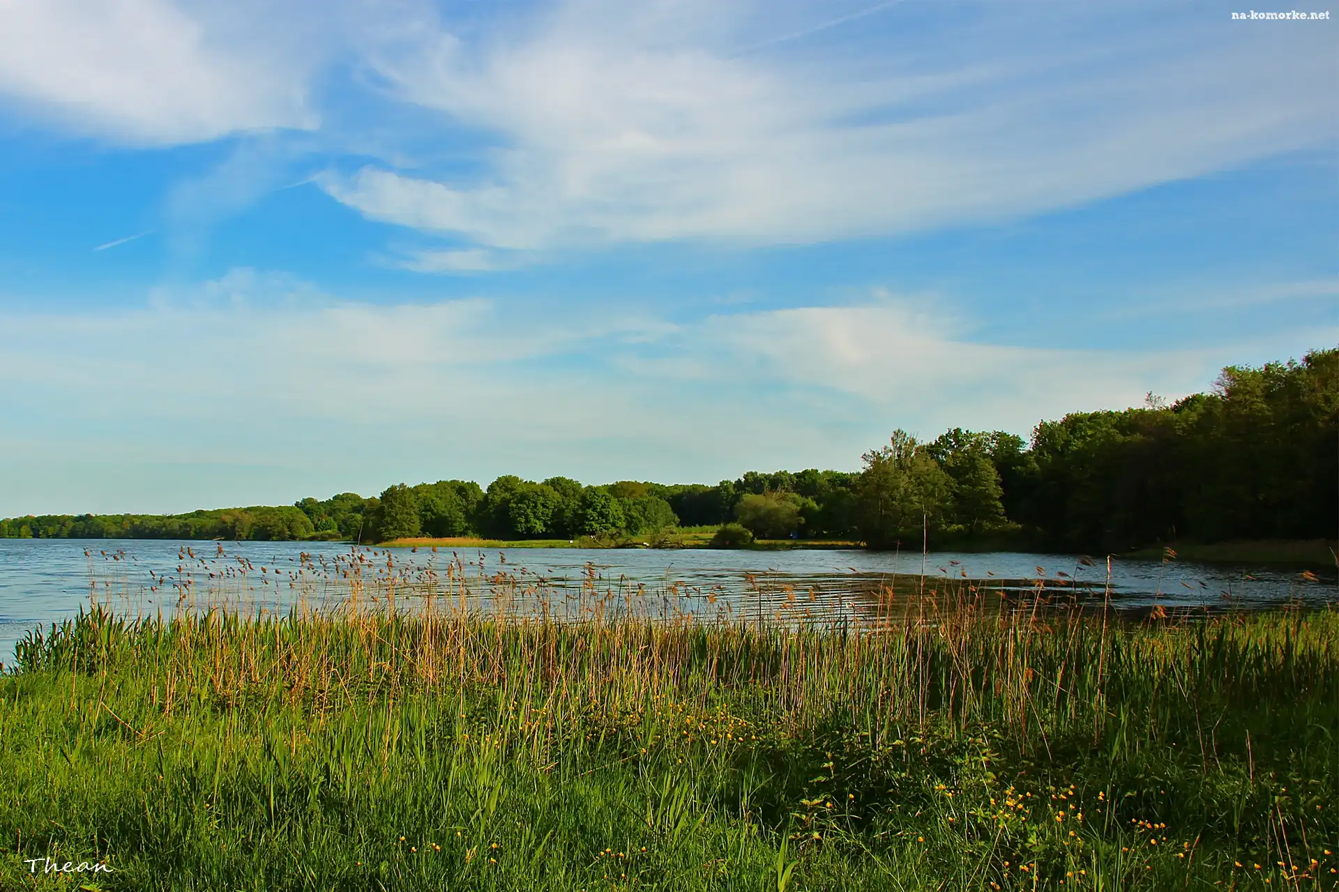 Jezioro, Drzewa, Łąka, Niebo na Komórkę