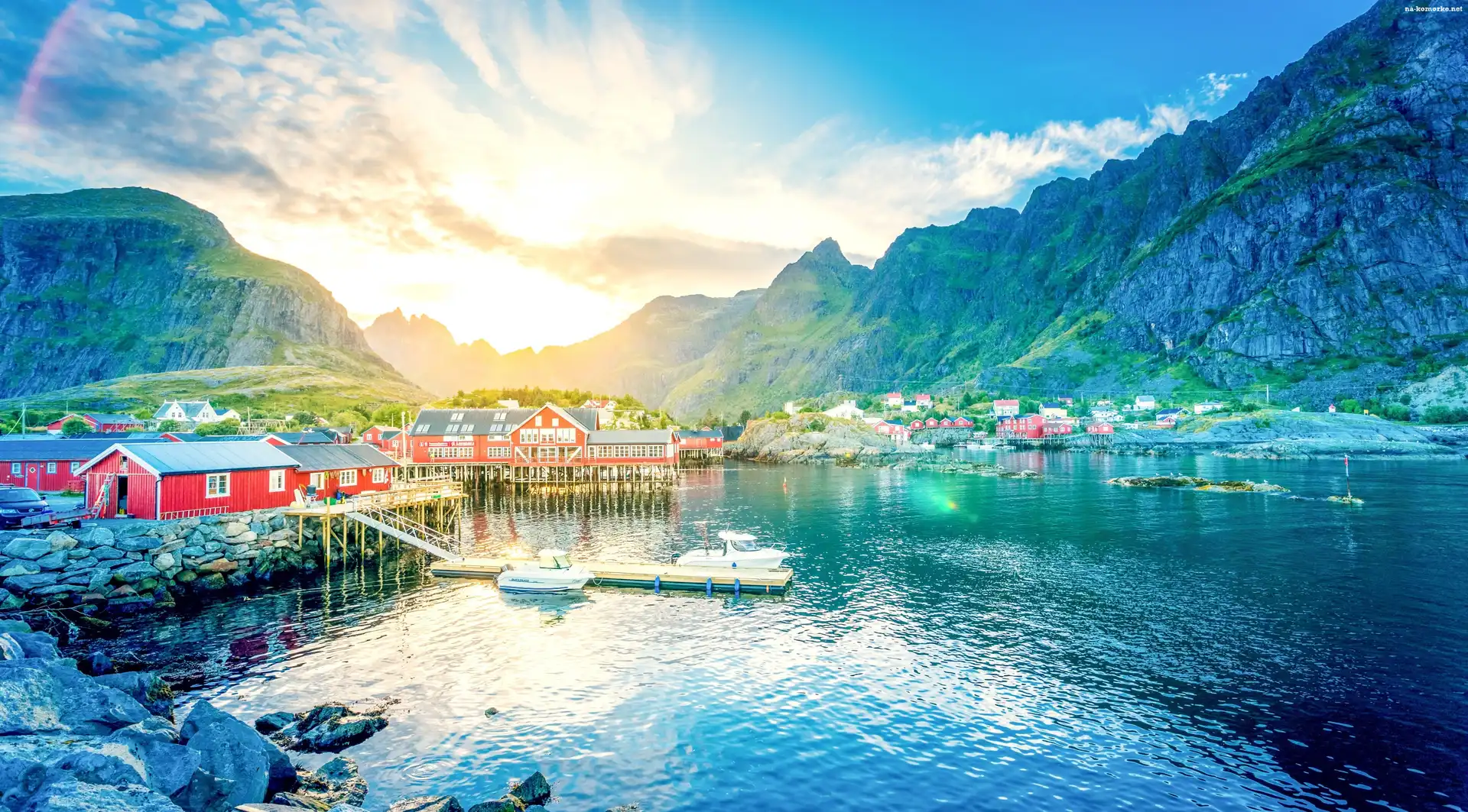 Budynki, Jezioro, Góry, Norwegia, Wschód słońca, Łodzie na Komórkę