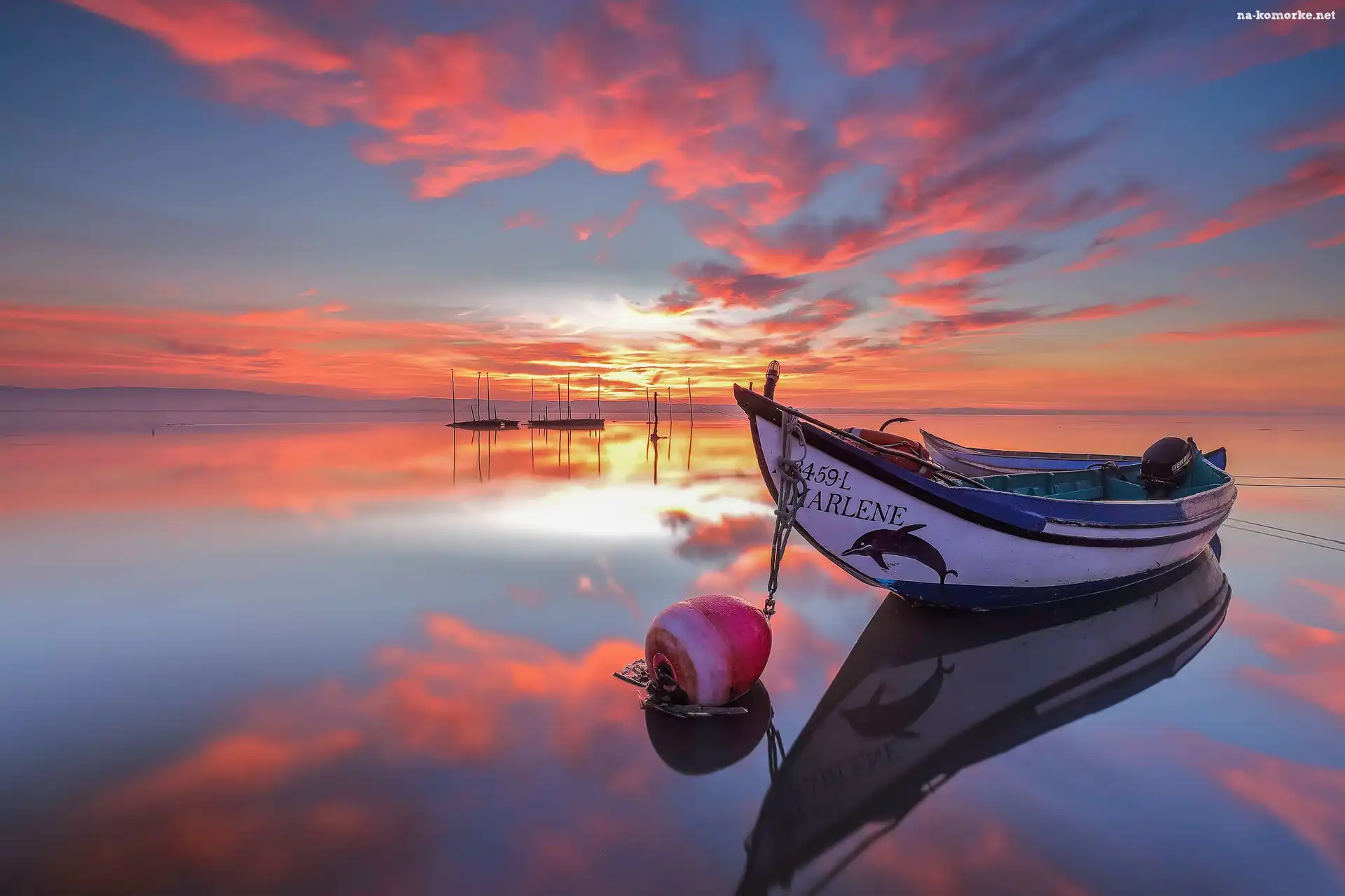 Chmury, Jezioro, Łódka, Wschód słońca, Niebo, Odbicie na Komórkę