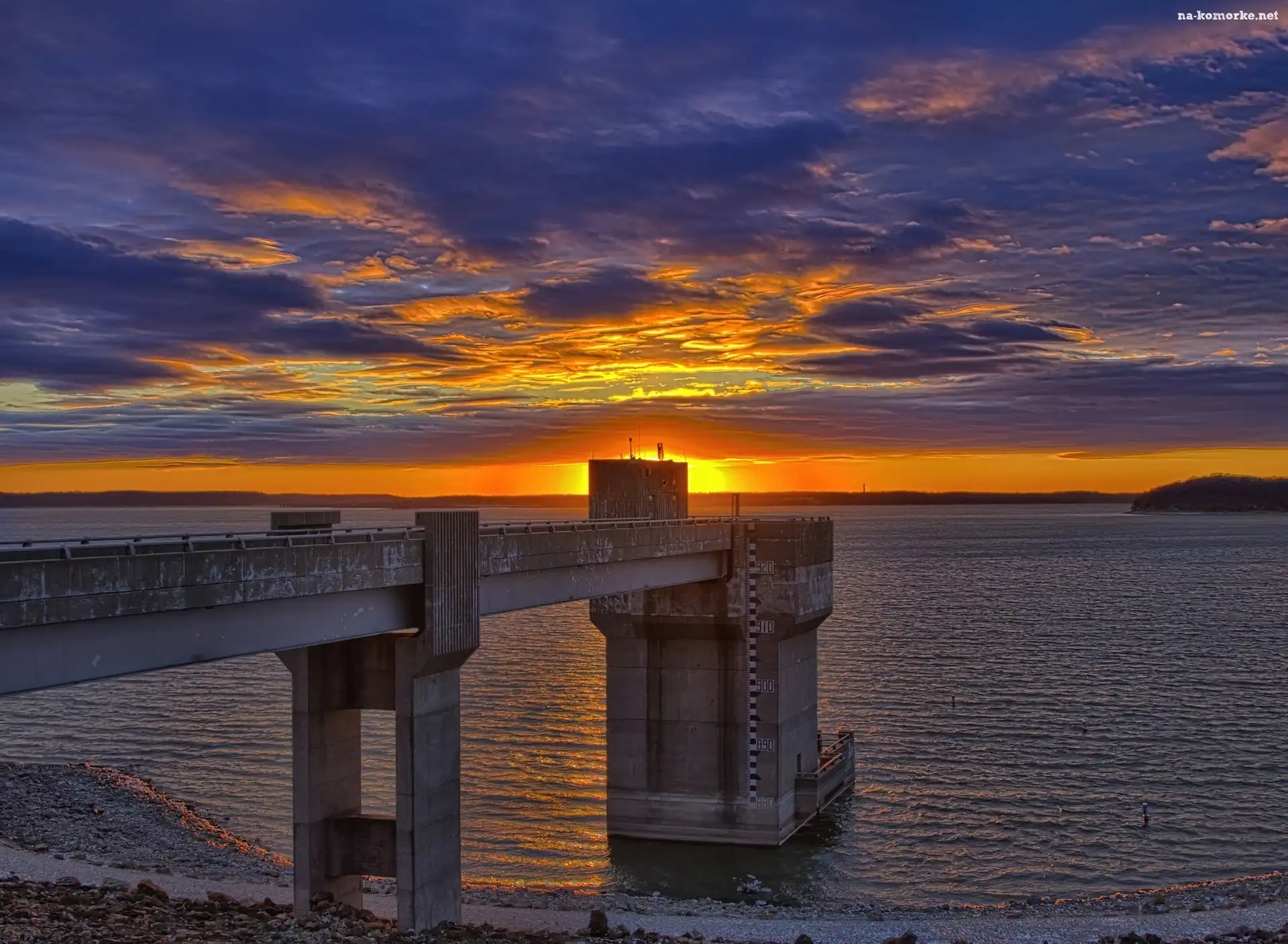 Jezioro, Słońca, Chmury, Zachód na Komórkę