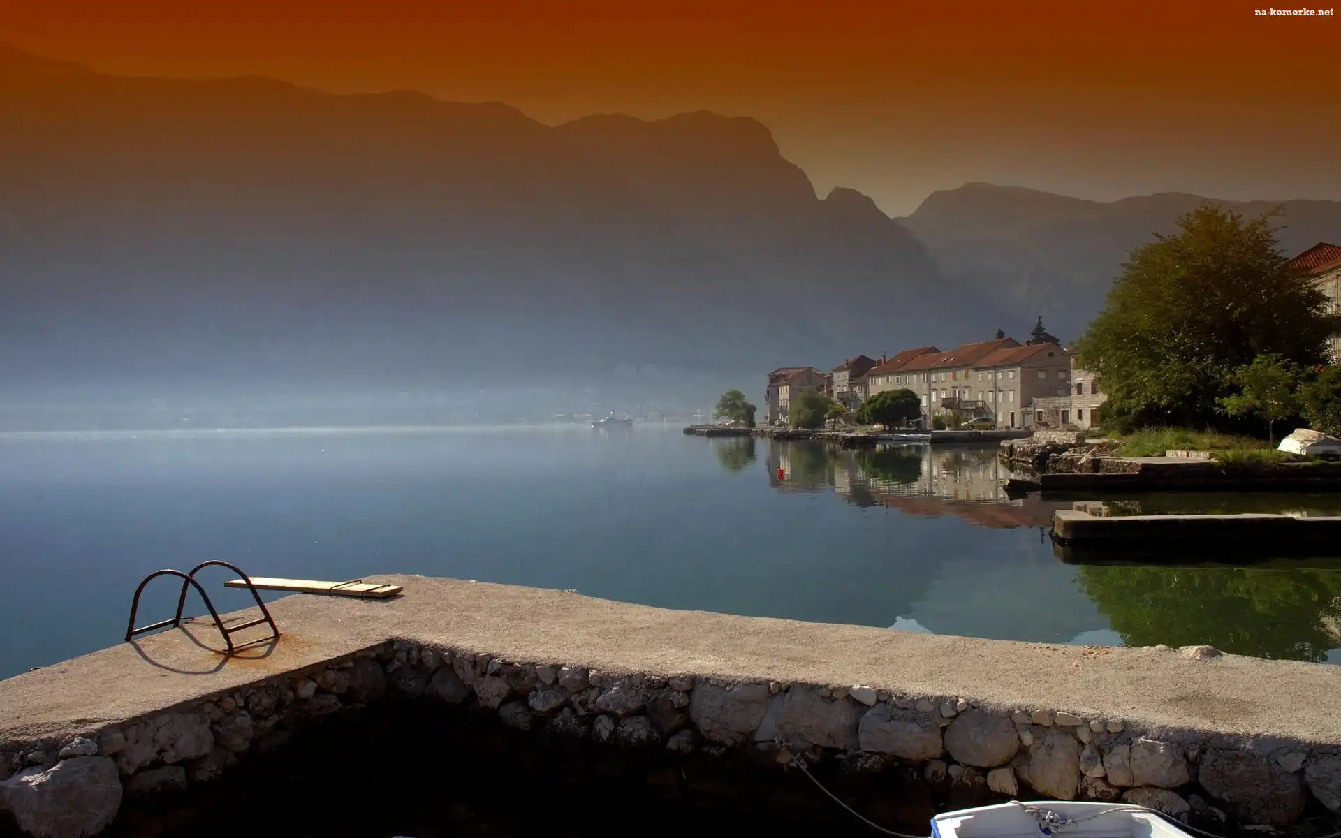 Jezioro, Czarnogóra, Kotor, Domy, Góry na Komórkę