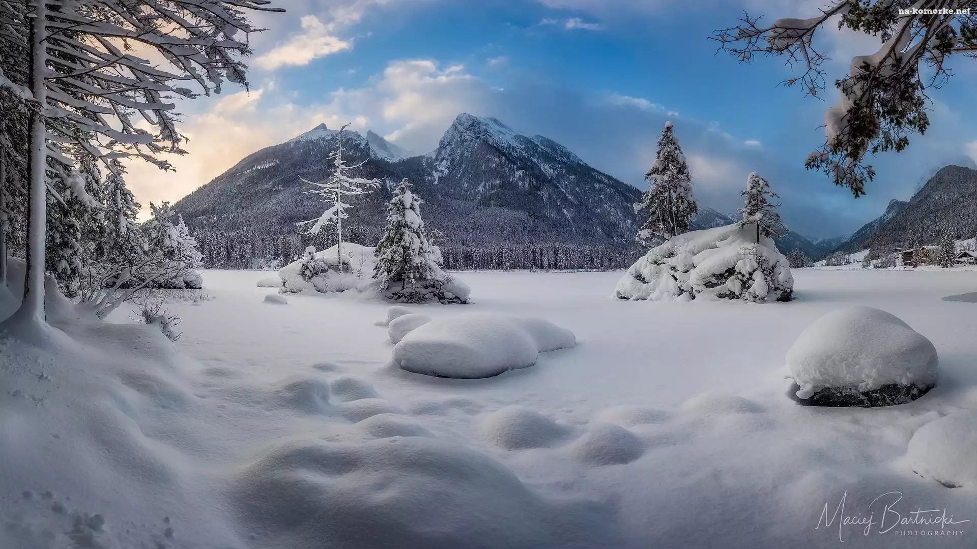 Alpy, Zima, Jezioro Hintersee, Drzewa, Niemcy, Góry, Bawaria, Zaśnieżone, Gmina Berchtesgaden na Komórkę |