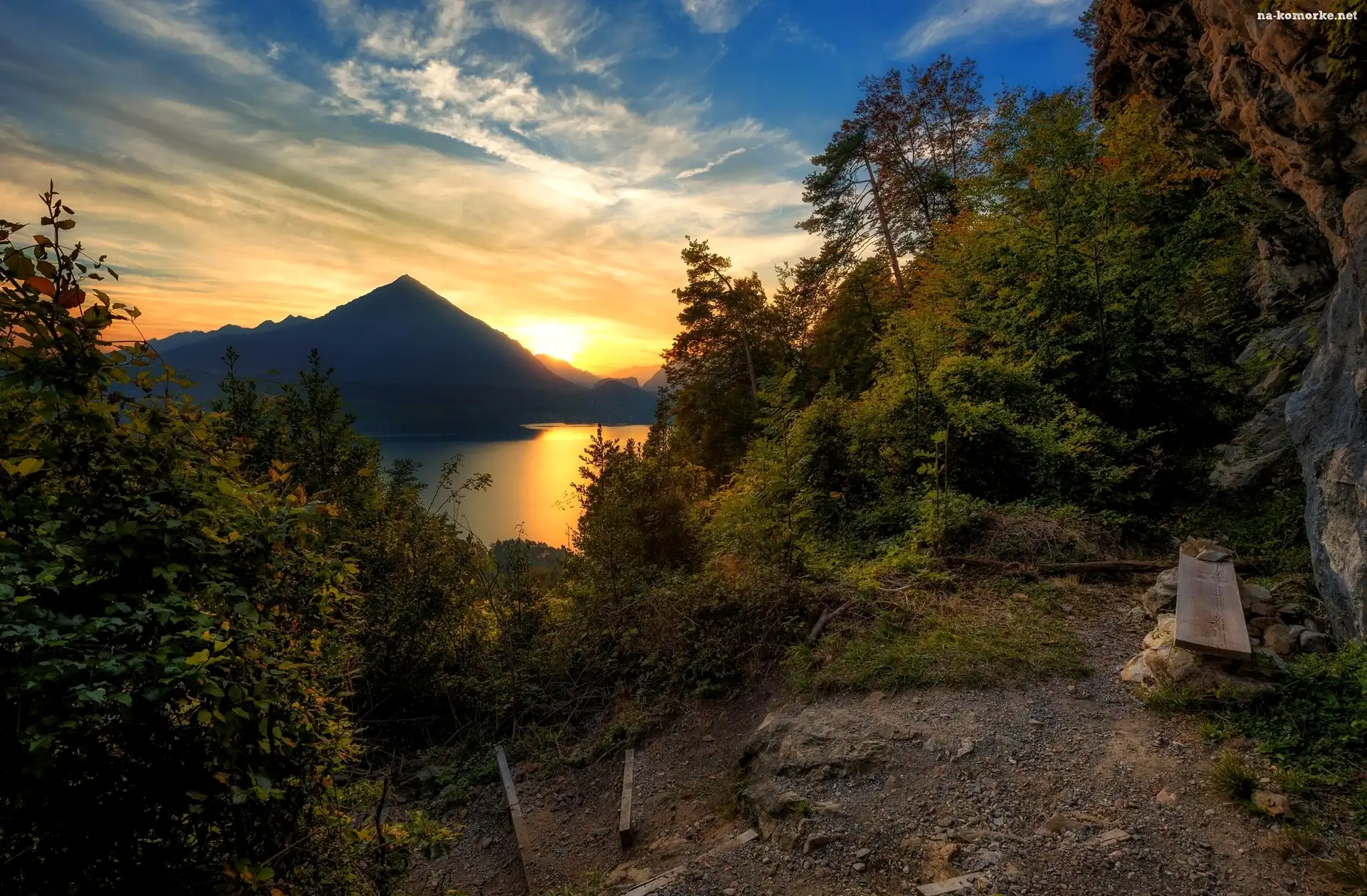 Drzewa, Jezioro, Góry, Kamienie, Zachód słońca, Deska na Komórkę
