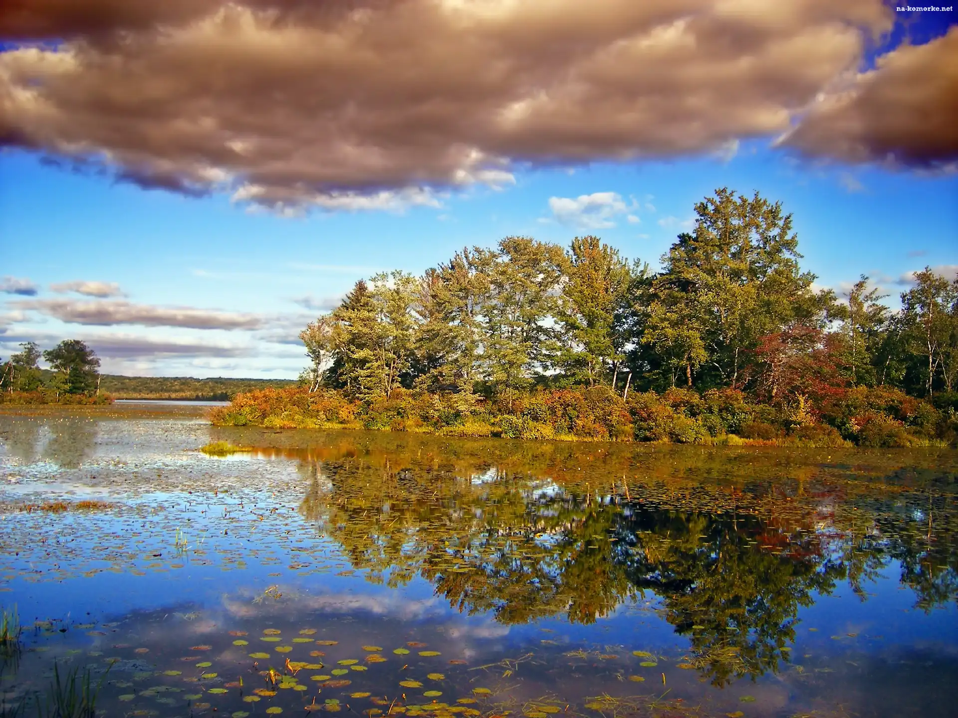 Jezioro, Jesień, Drzewa, Chmury na Komórkę