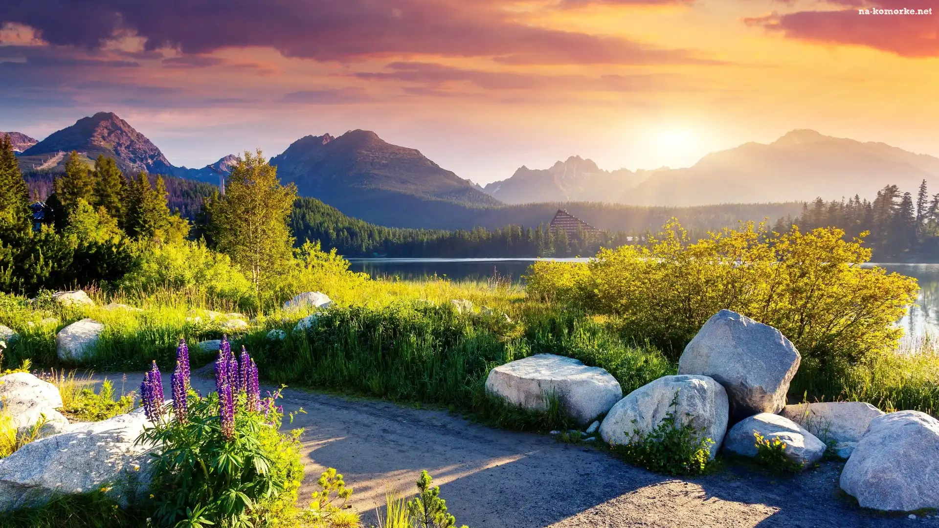 Zachód słońca, Niebo, Tatry Wysokie, Kwiaty, Szczyrbskie Jezioro, Tatrzański Park Narodowy, Drzewa, Kamienie, Góry, Słowacja na Komórkę |