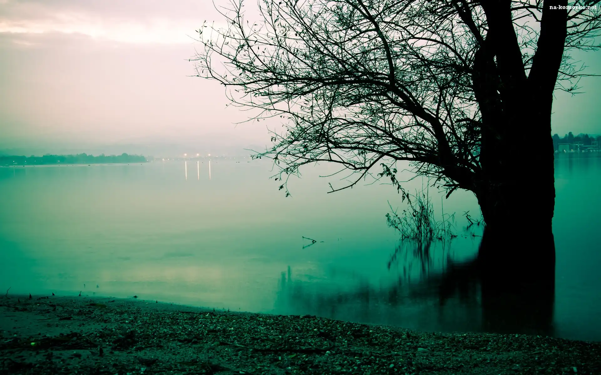 Jezioro, Jesień, Drzewo, Zmrok na Komórkę