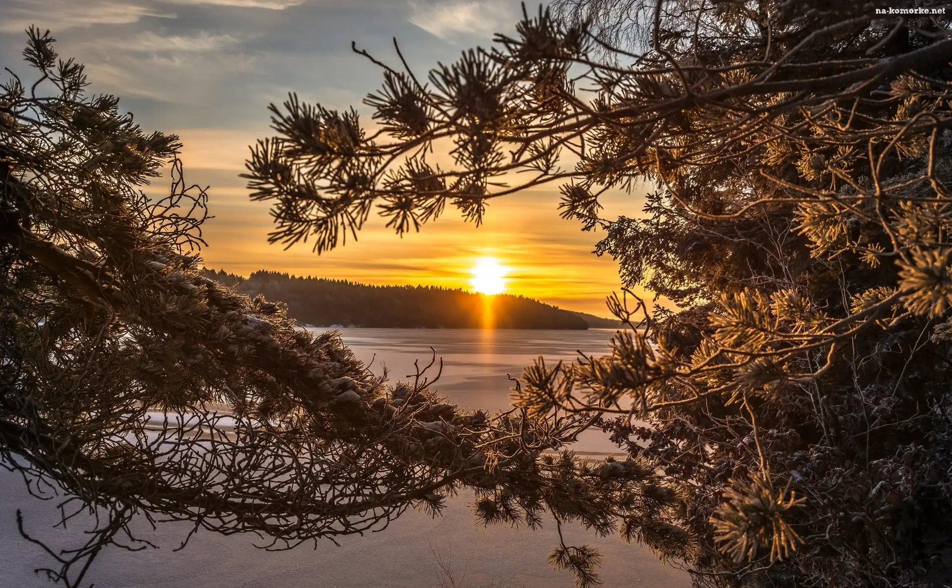 Jezioro, Wschód słońca, Gałęzie, Drzewa na Komórkę