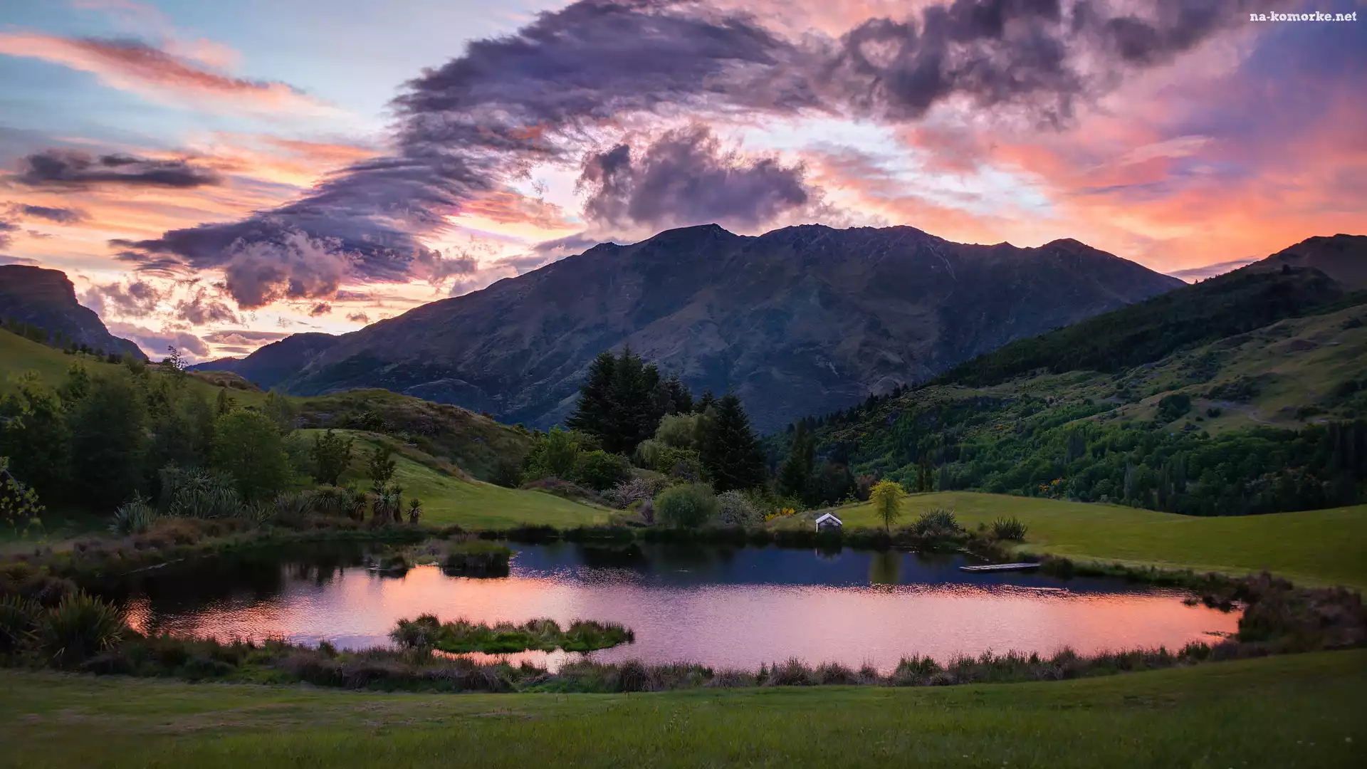 Jezioro, Chmury, Góry, Las na Komórkę