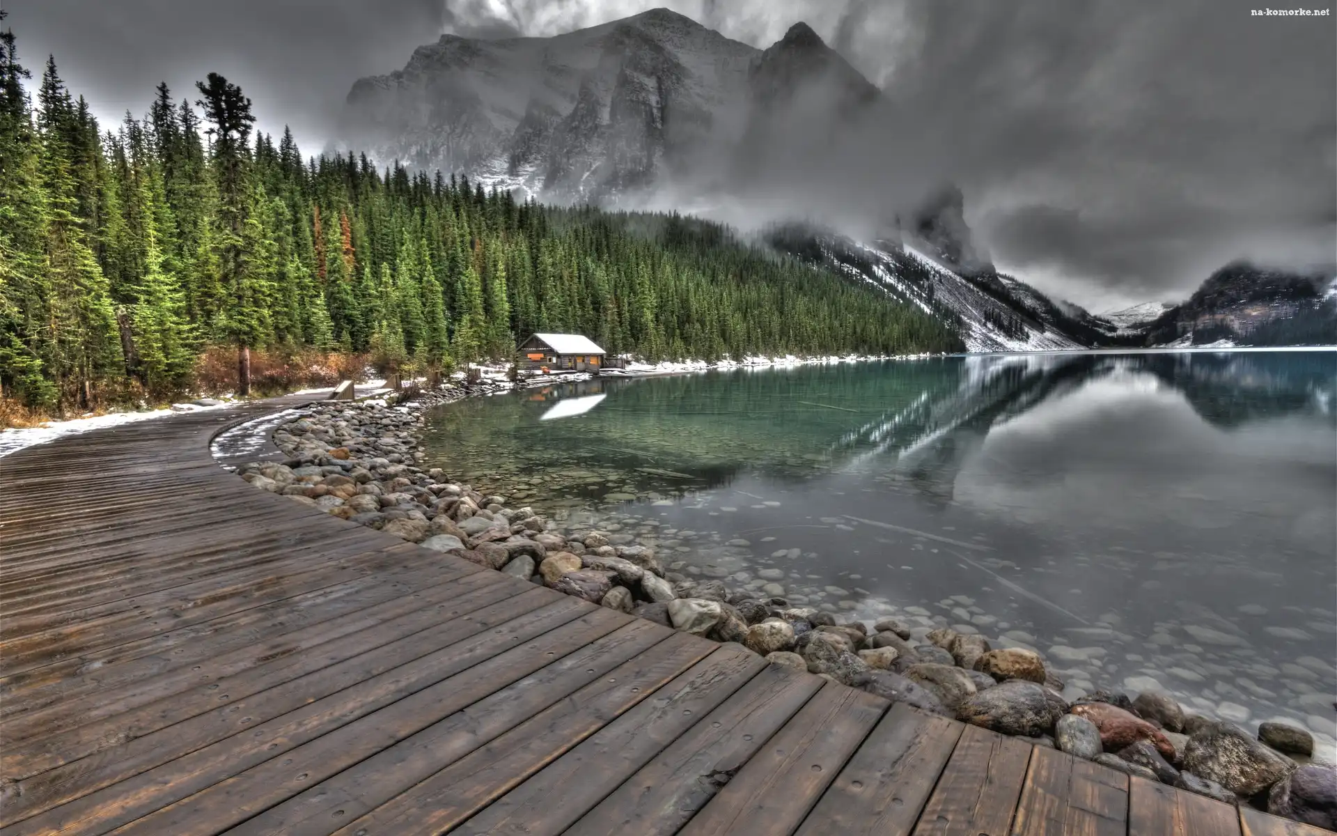 Jezioro, Chmury, Góry, Las na Komórkę