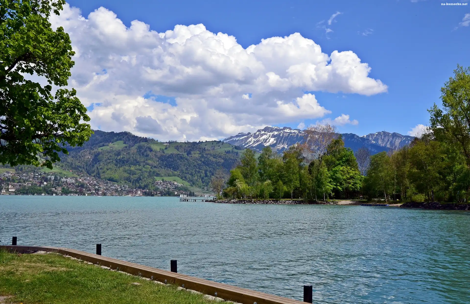 Jezioro, Domy, Góry, Drzewa na Komórkę