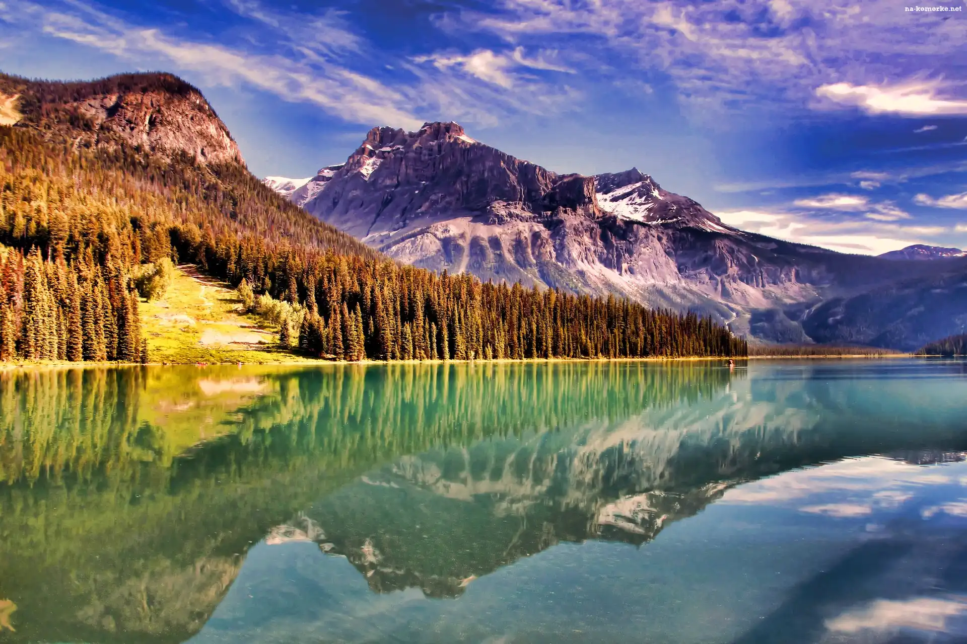 Jezioro, Drzewa, Góry, Odbicie na Komórkę