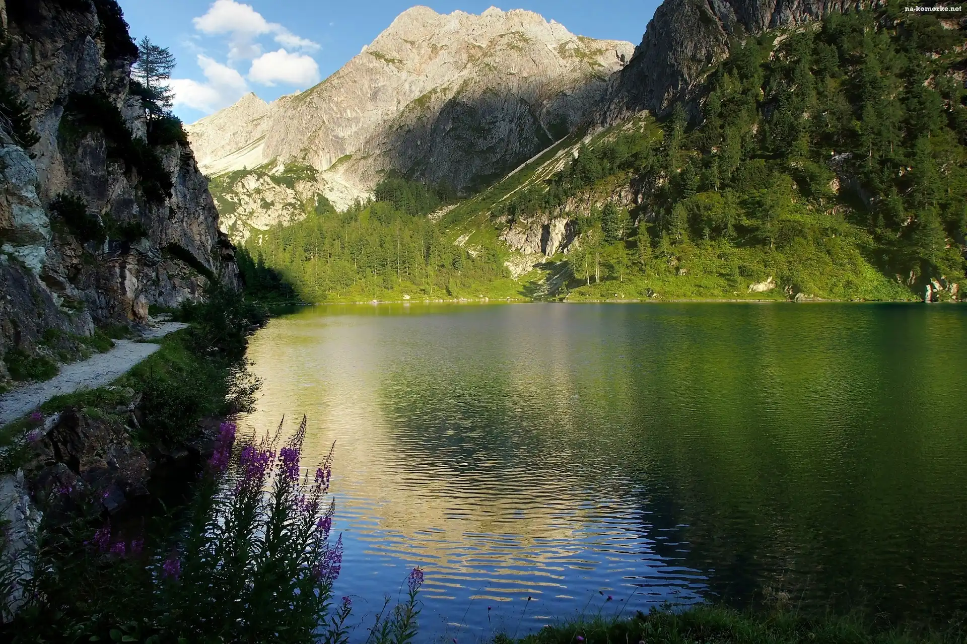 Jezioro, Iglaki, Góry, Drzewa na Komórkę