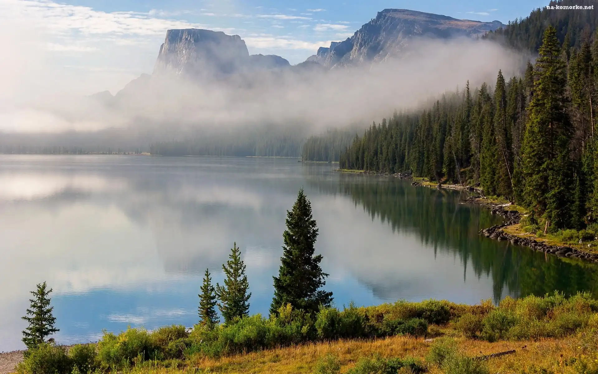 Jezioro, Mgła, Góry, Lasy na Komórkę