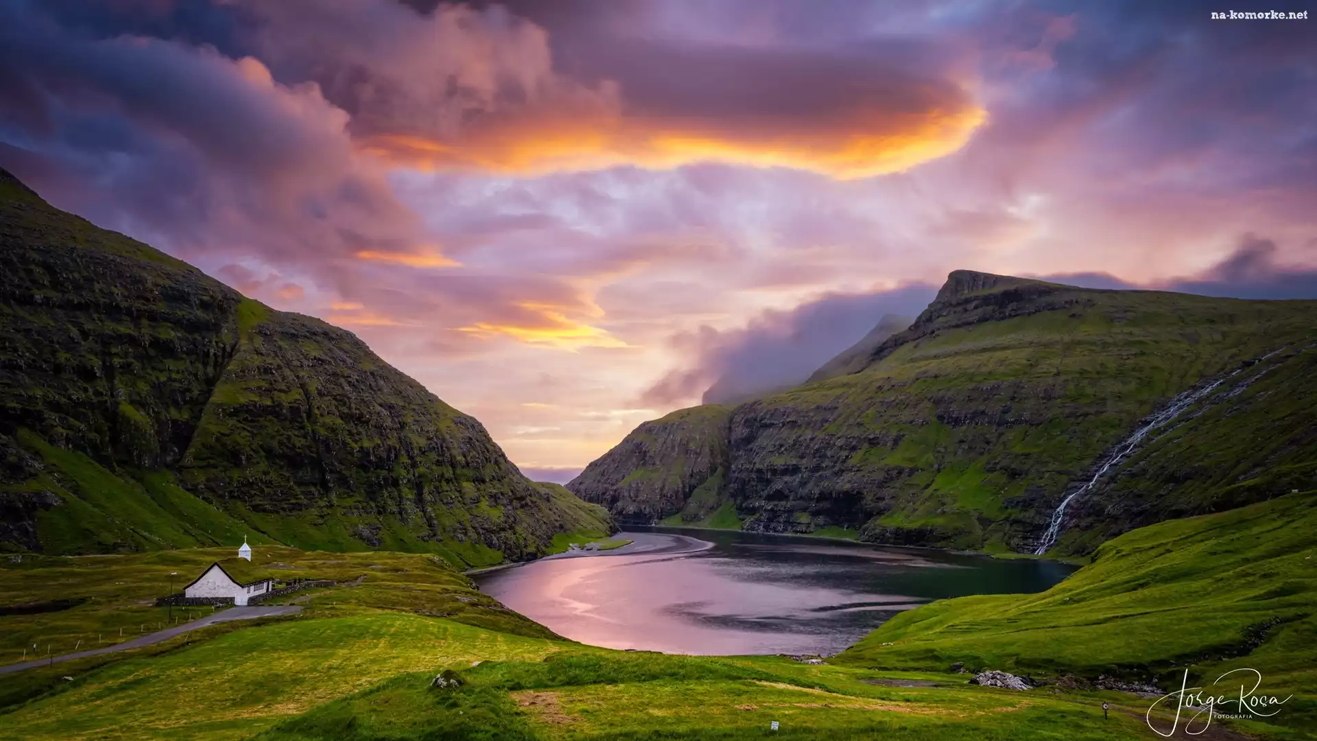 Chmury, Laguna Pollurin, Dania, Droga, Kościół, Jezioro, Góry, Saksun, Wyspy Owcze na Komórkę