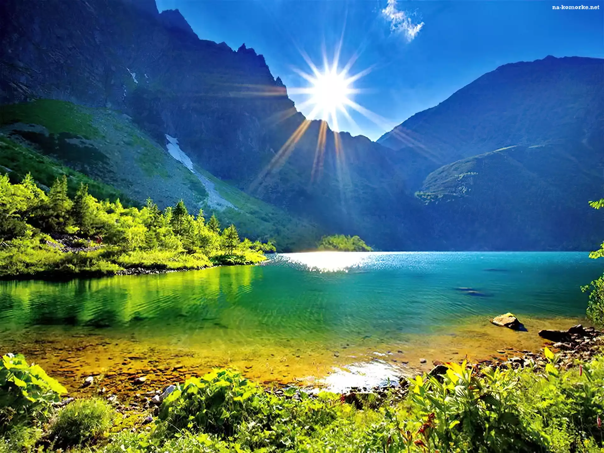 Jezioro, Promienie, Góry, Słońce na Komórkę
