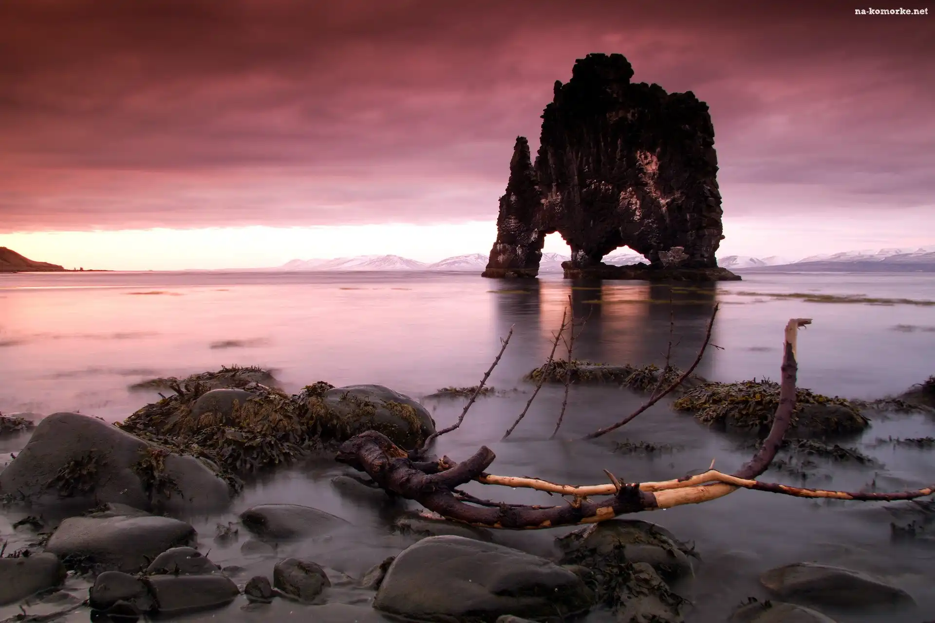 Jezioro, Zachód, Słońca, Góry, Skała na Komórkę