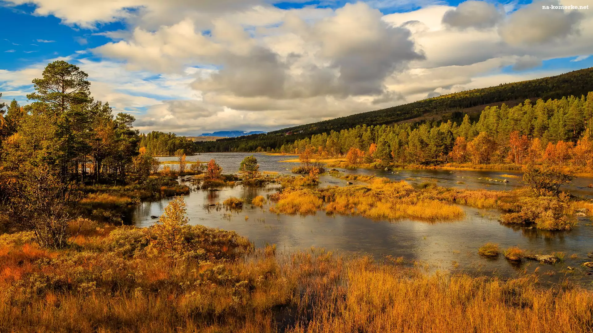 Lasy, Jezioro, Jesień, Norwegia, Drzewa, Park Narodowy Hardangervidda na Komórkę
