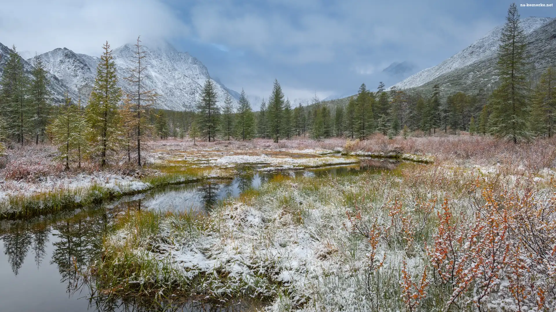 Jezioro, Magadan, Drzewa, Góry, Zima, Rosja, Jacka Londona, Kołymskie na Komórkę