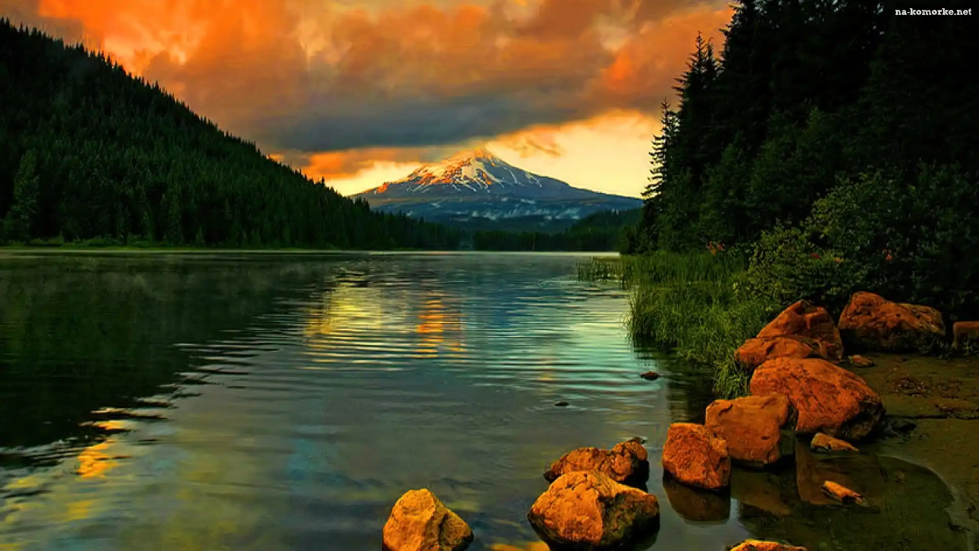 Jezioro, Zachód Słońca, Kamienie, Niebo na Komórkę
