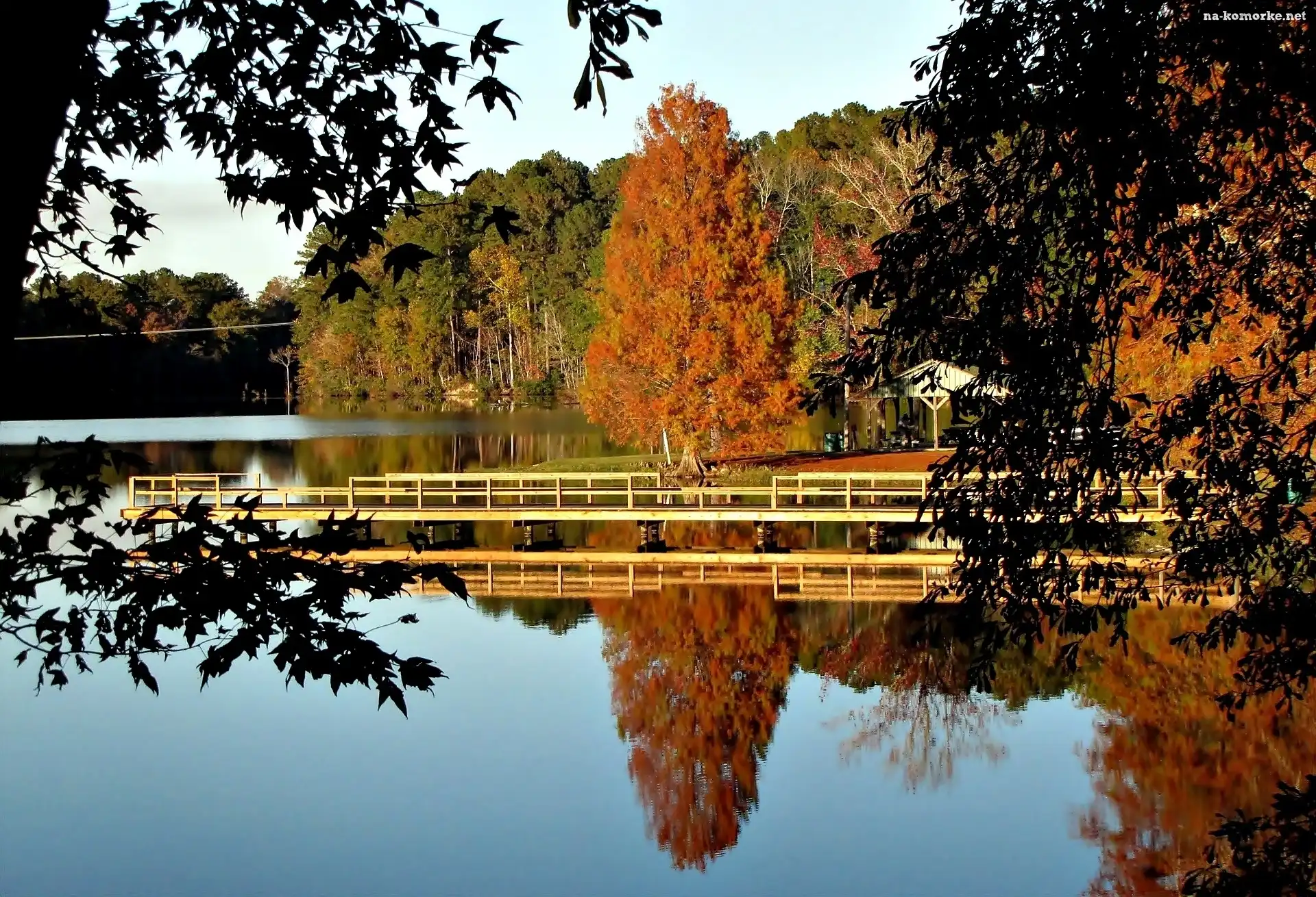 Jezioro, Jesień, Lasy, Pomost na Komórkę