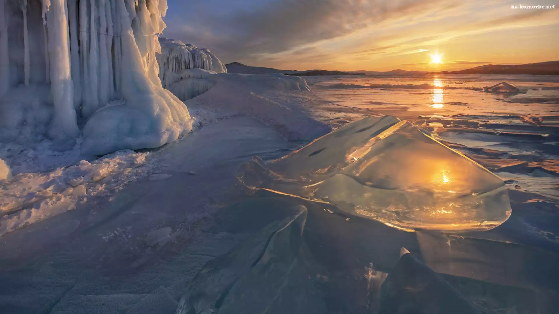 Zima, Zachód słońca, Jezioro, Mróz, Lód na Komórkę
