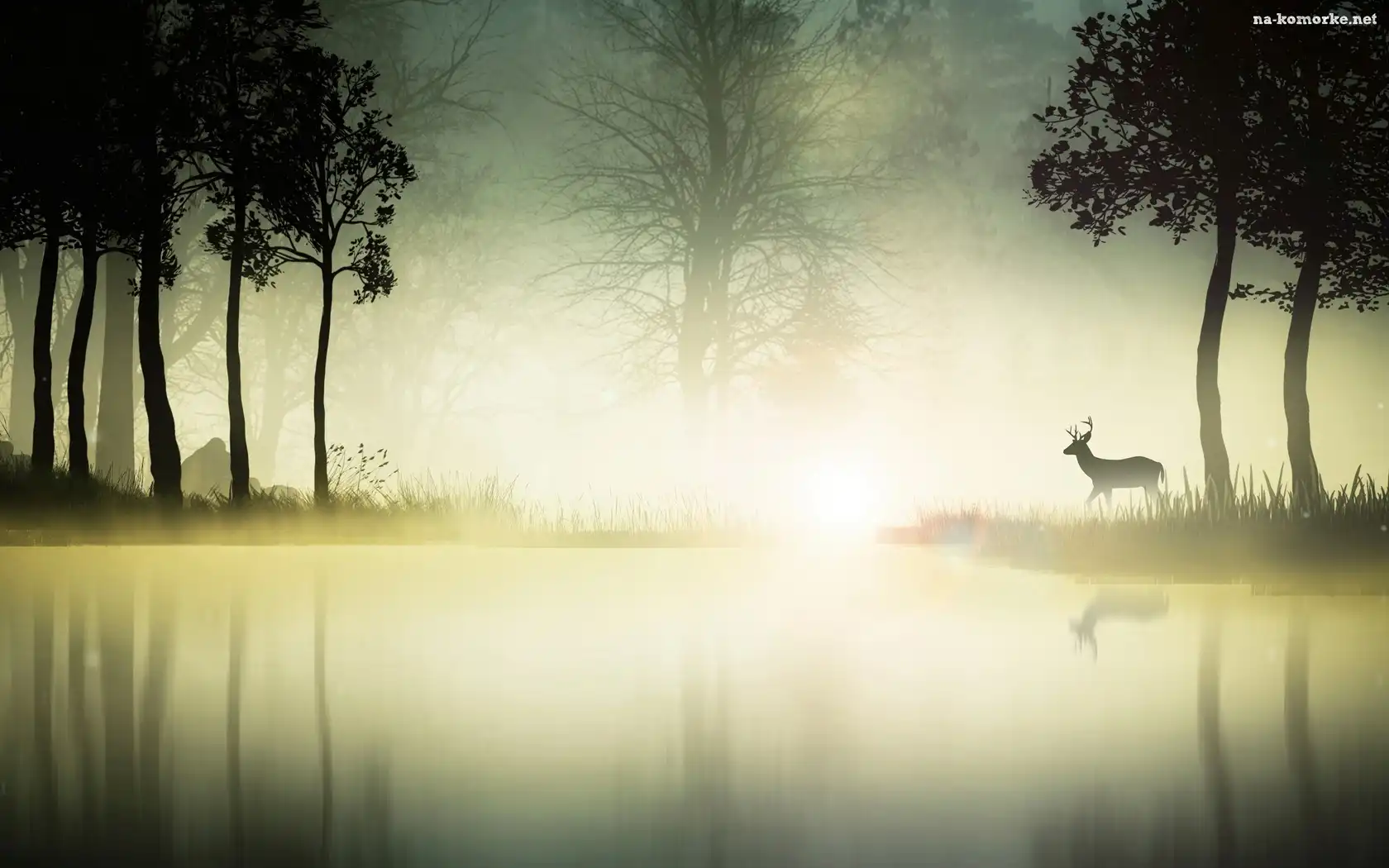 Jezioro, Jeleń, Mgła, Las na Komórkę
