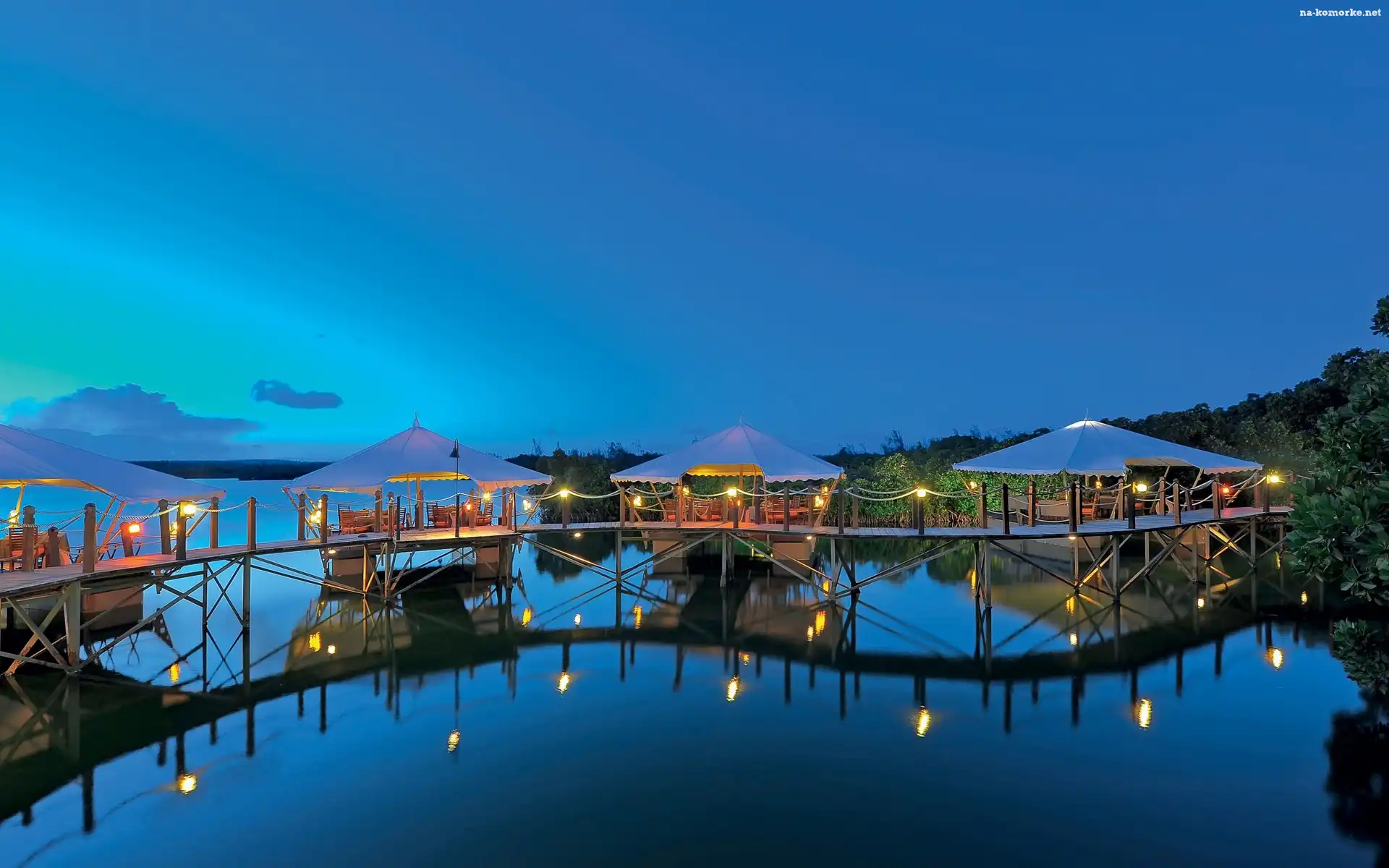 Jezioro, Restauracja, Parasole, Mostek, Oświetlenie na Komórkę