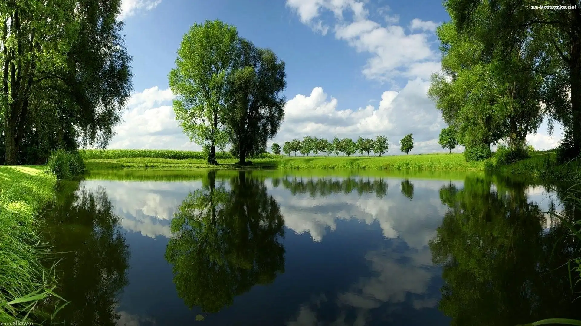 Jezioro, Drzewa, Niebo, Chmury na Komórkę