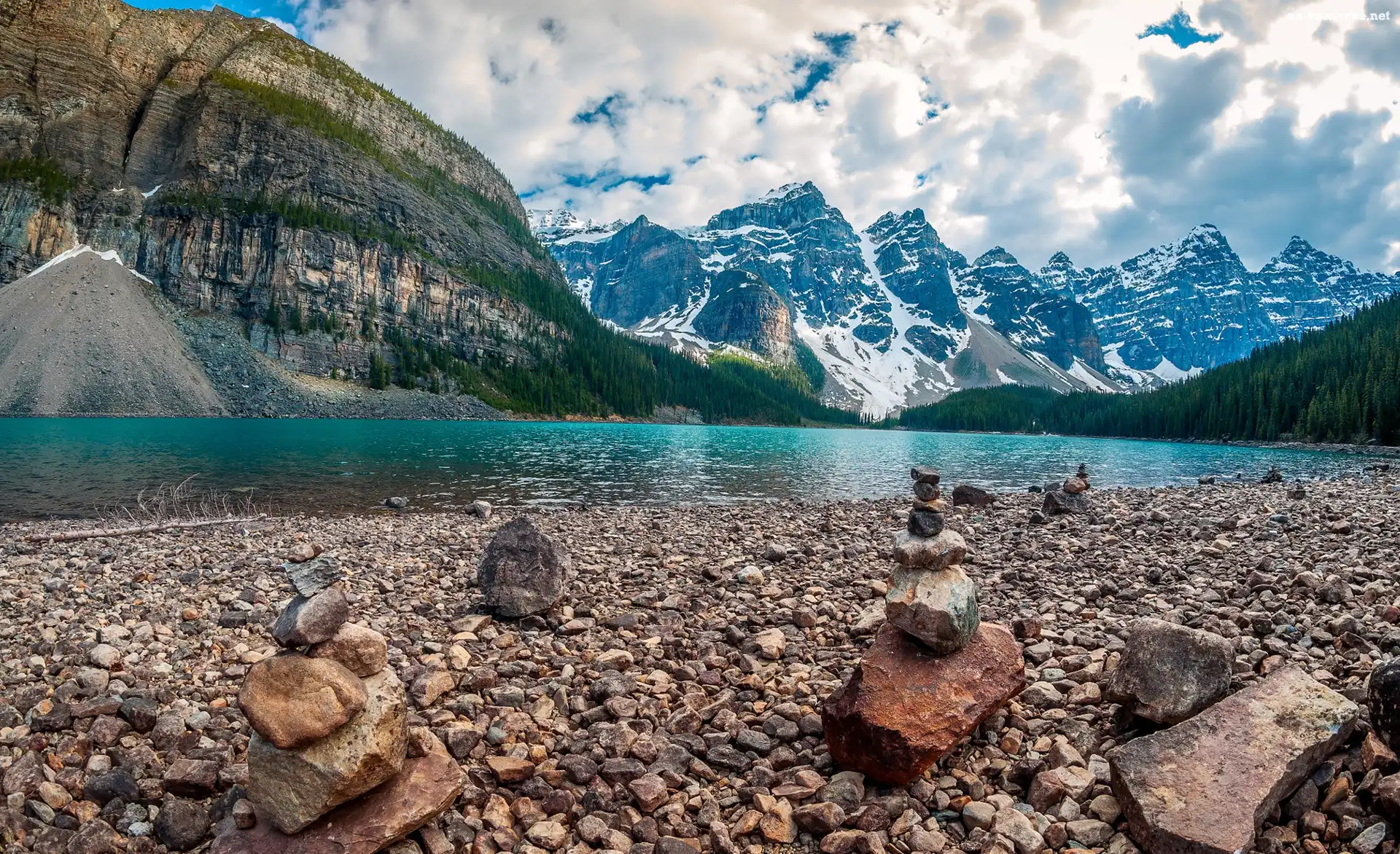 Park Narodowy Banff, Prowincja Alberta, Jezioro Moraine, Kanada, Góry, Kamienie, Drzewa, Chmury na Komórkę |