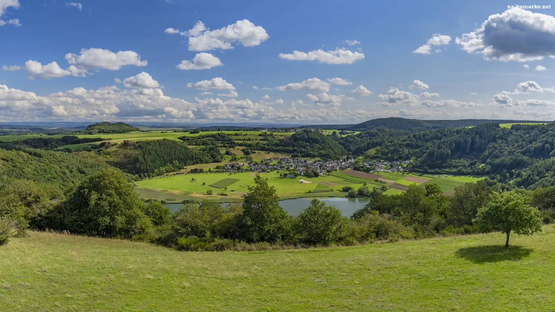 Drzewa, Wzgórza, Domy, Jezioro, Miasteczko, Pole na Komórkę