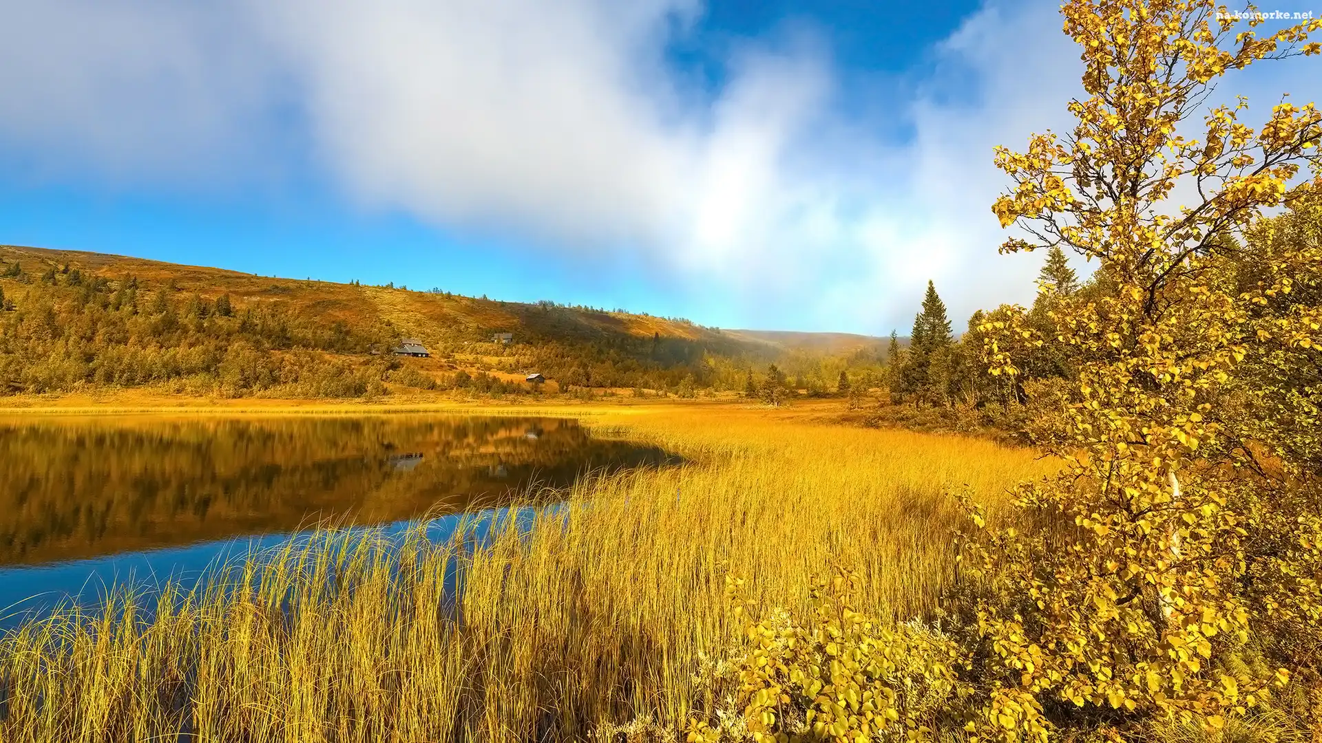 Drzewa, Jesień, Wzgórze, Jezioro, Trawa, Pole na Komórkę