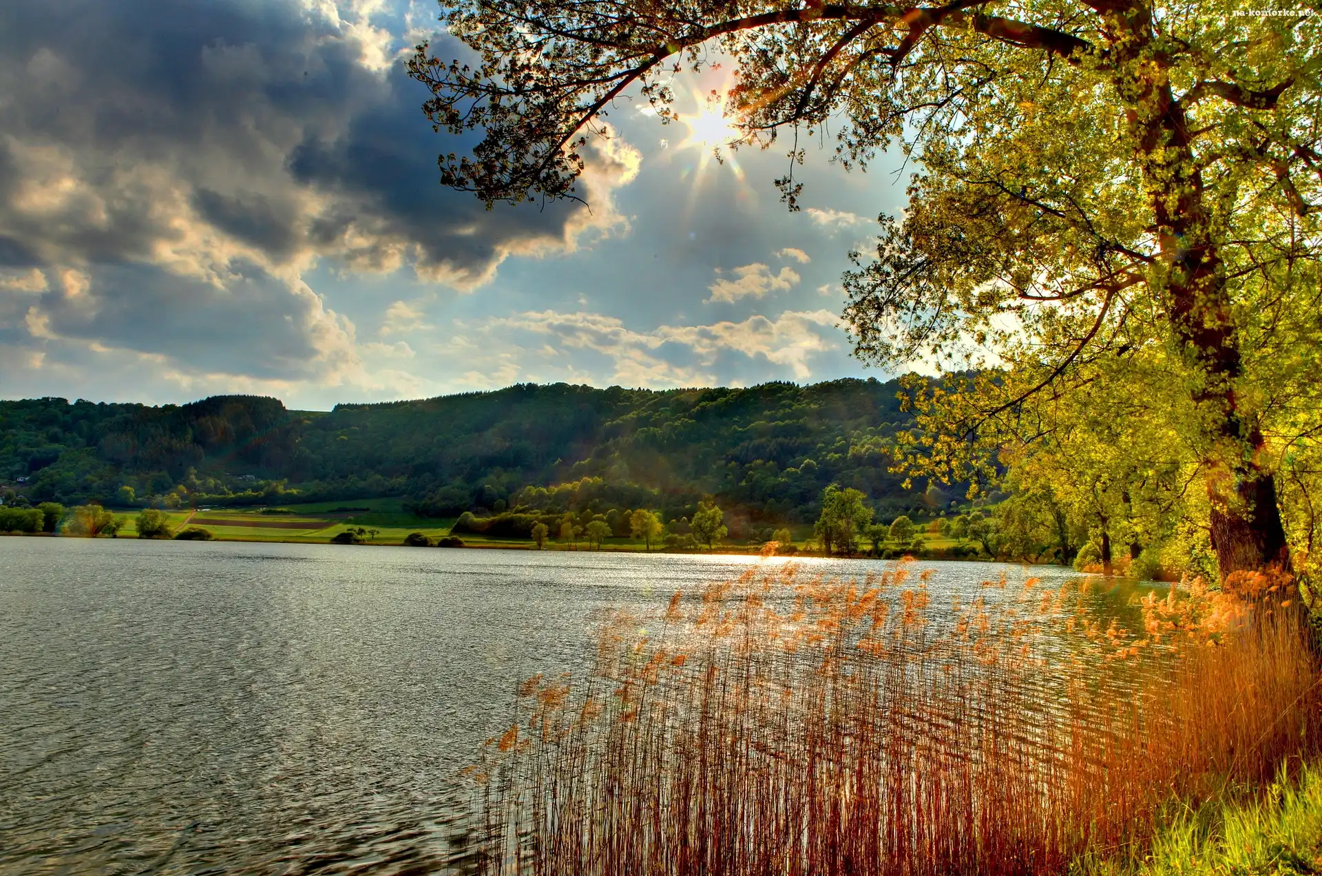 Jezioro, Drzewo, Promienie Słońca na Komórkę