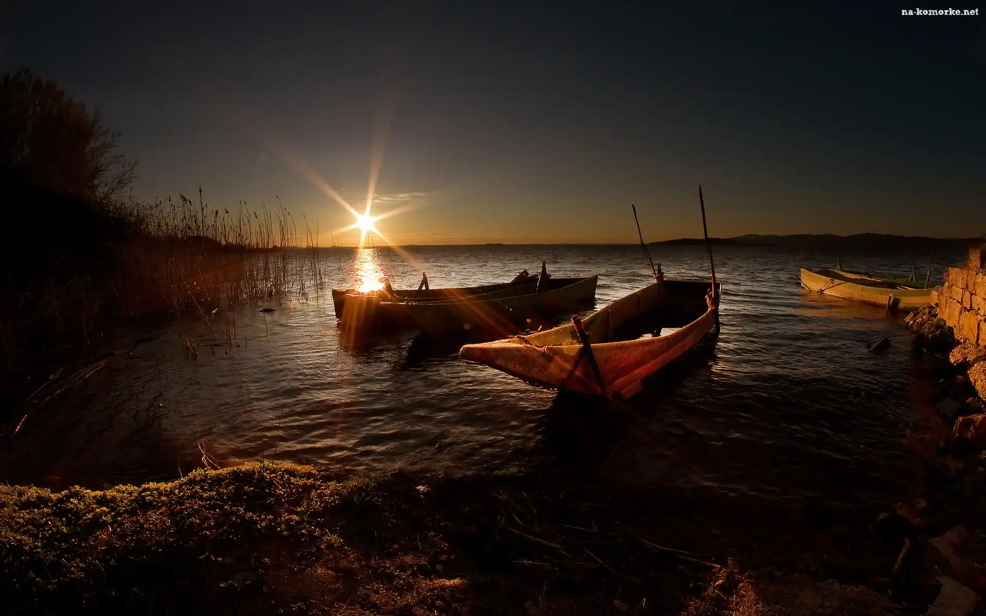 Jezioro, Zachód, Słońca, Promienie, Łajby na Komórkę