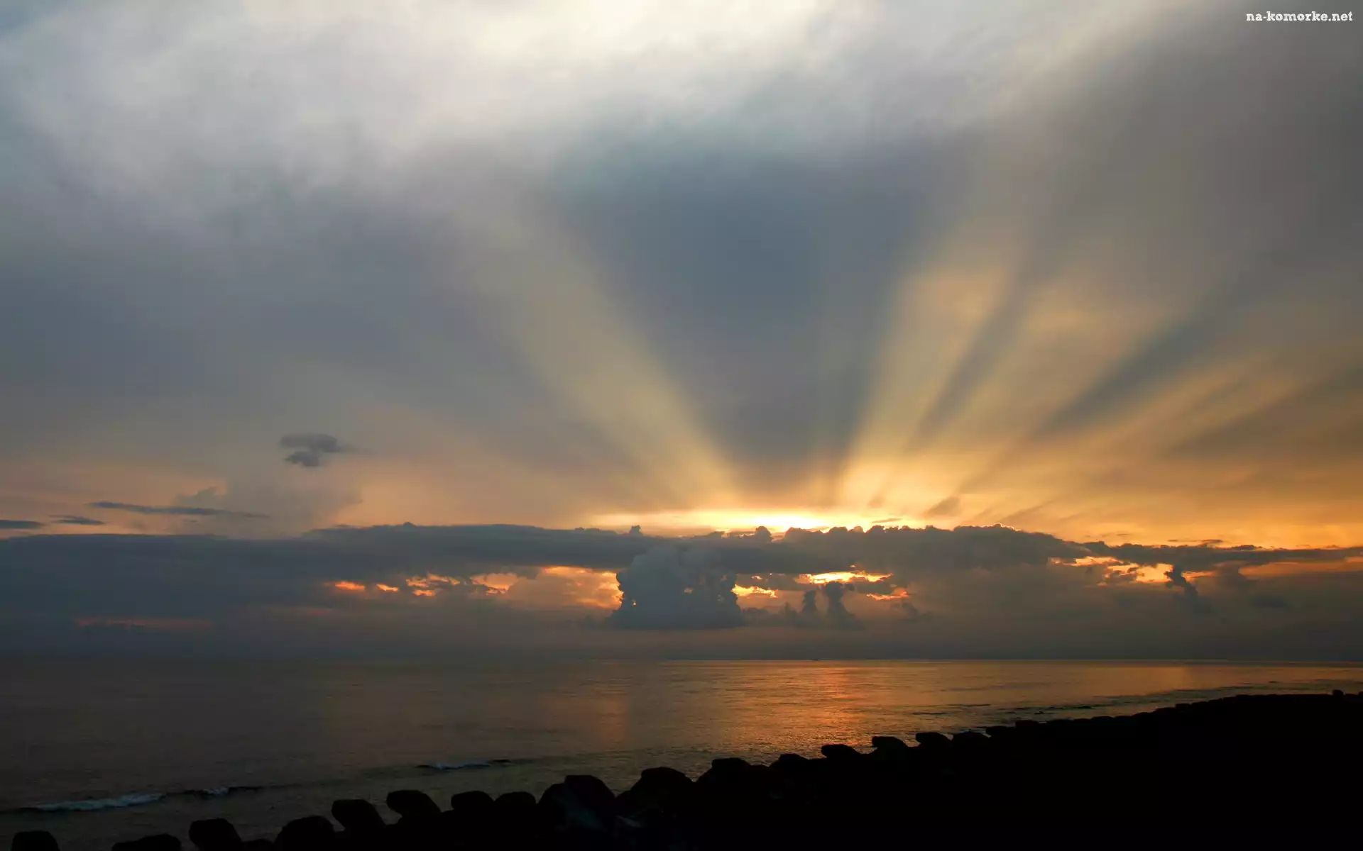 Jezioro, Zachód, Słońce, Promienie, Chmury na Komórkę