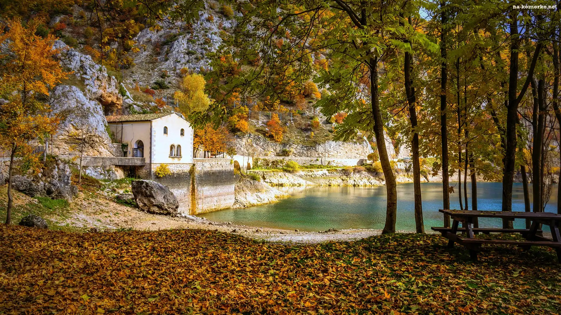 Jezioro, Ławeczka, Skały, Drzewa na Komórkę