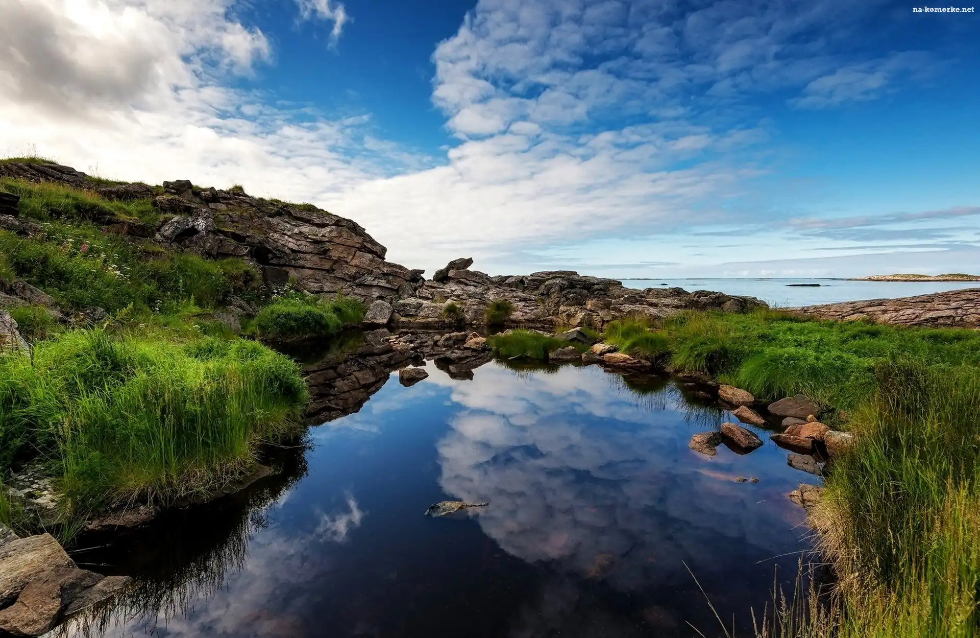 Jezioro, Odbicie, Skały, Chmury na Komórkę