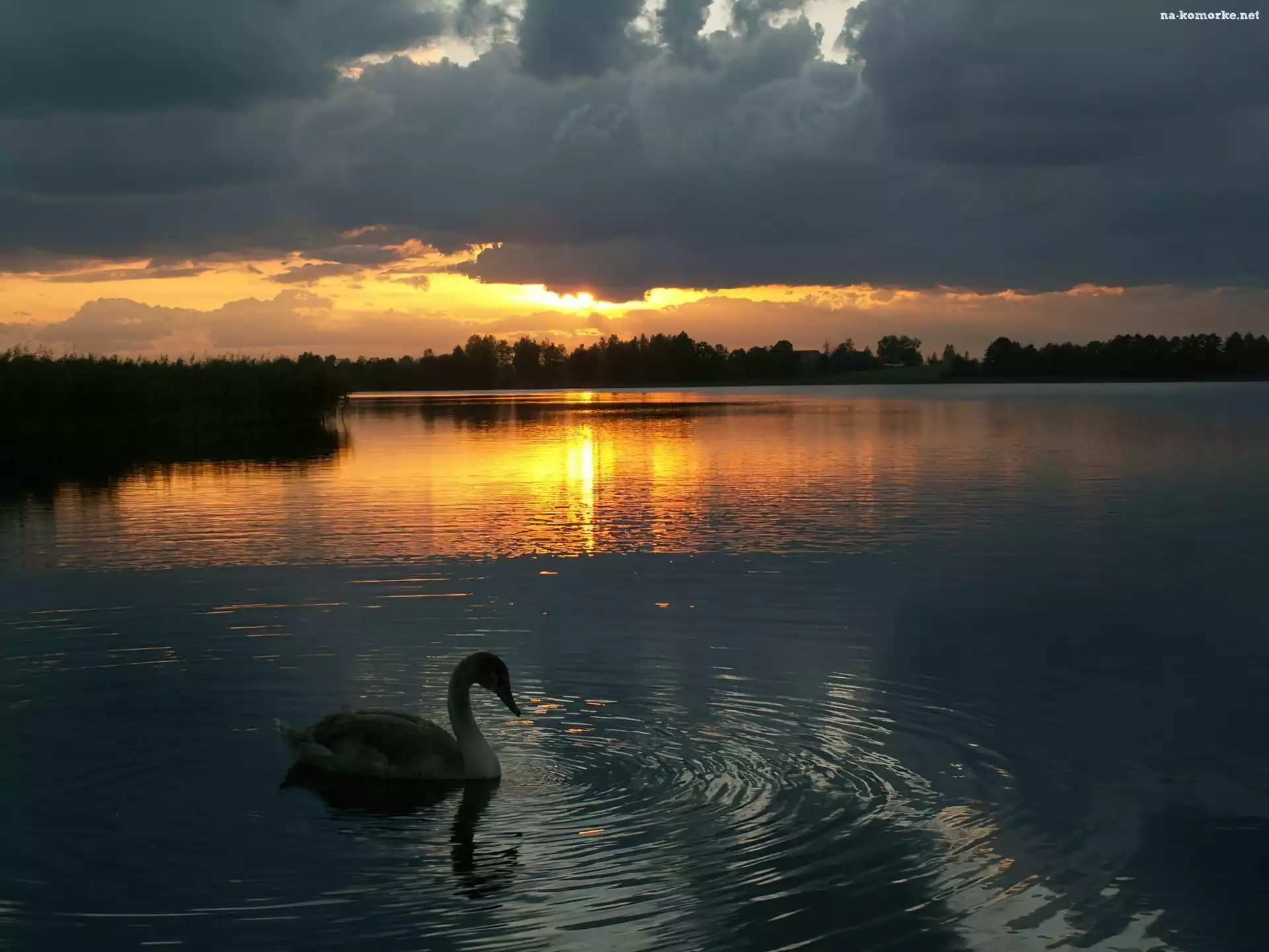 Łabędź, Słońca, Jezioro, Zachód na Komórkę