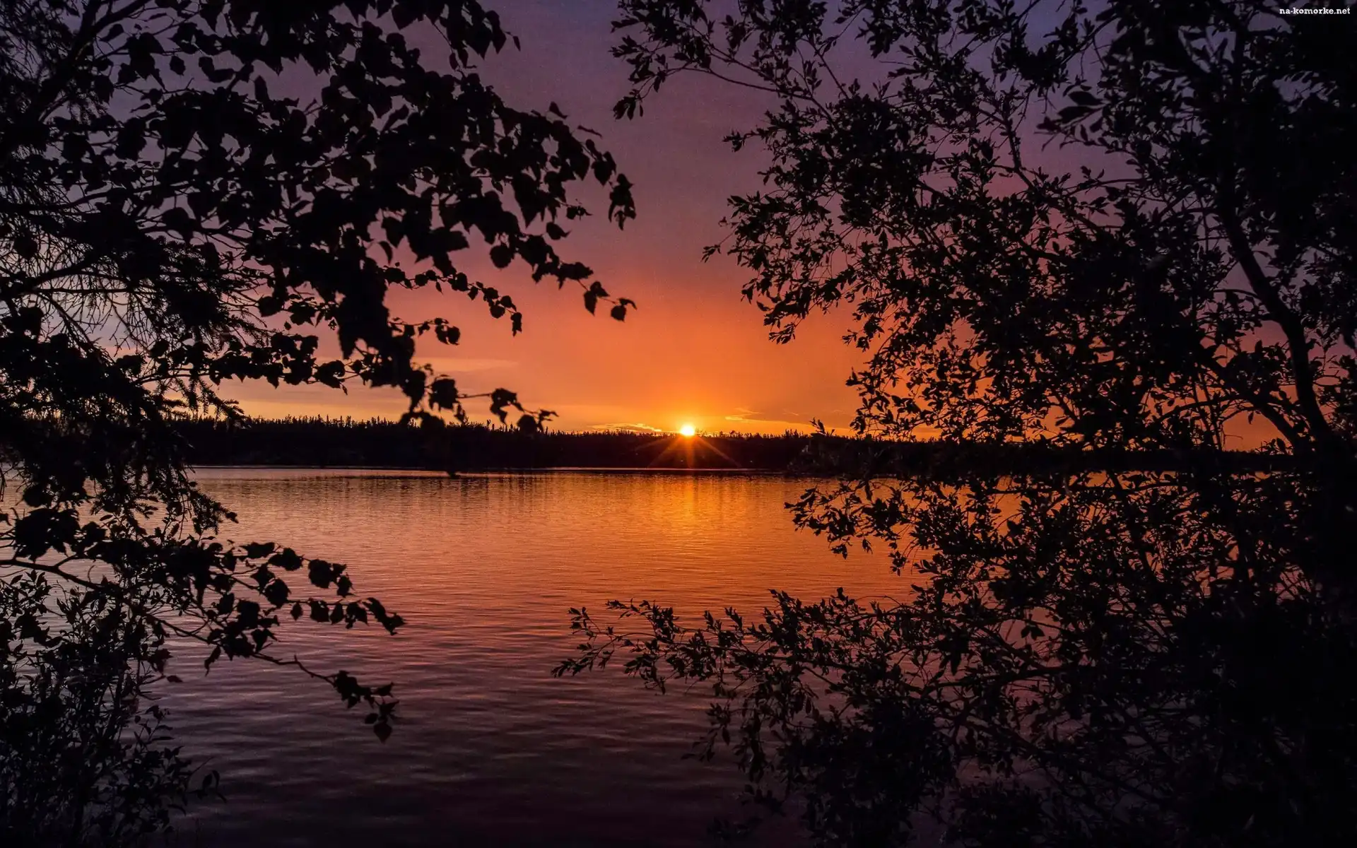 Jezioro, Gałęzie drzew, Zachód słońca, Las na Komórkę