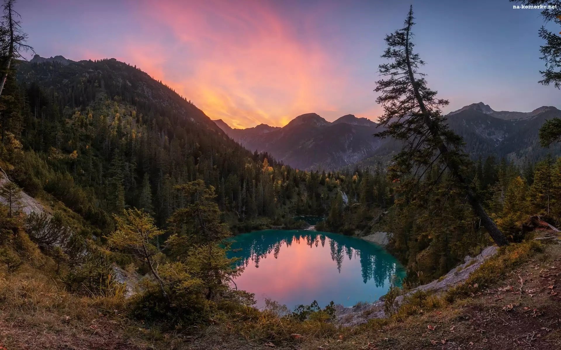 Góry, Las, Drzewa, Jezioro, Zachód słońca na Komórkę