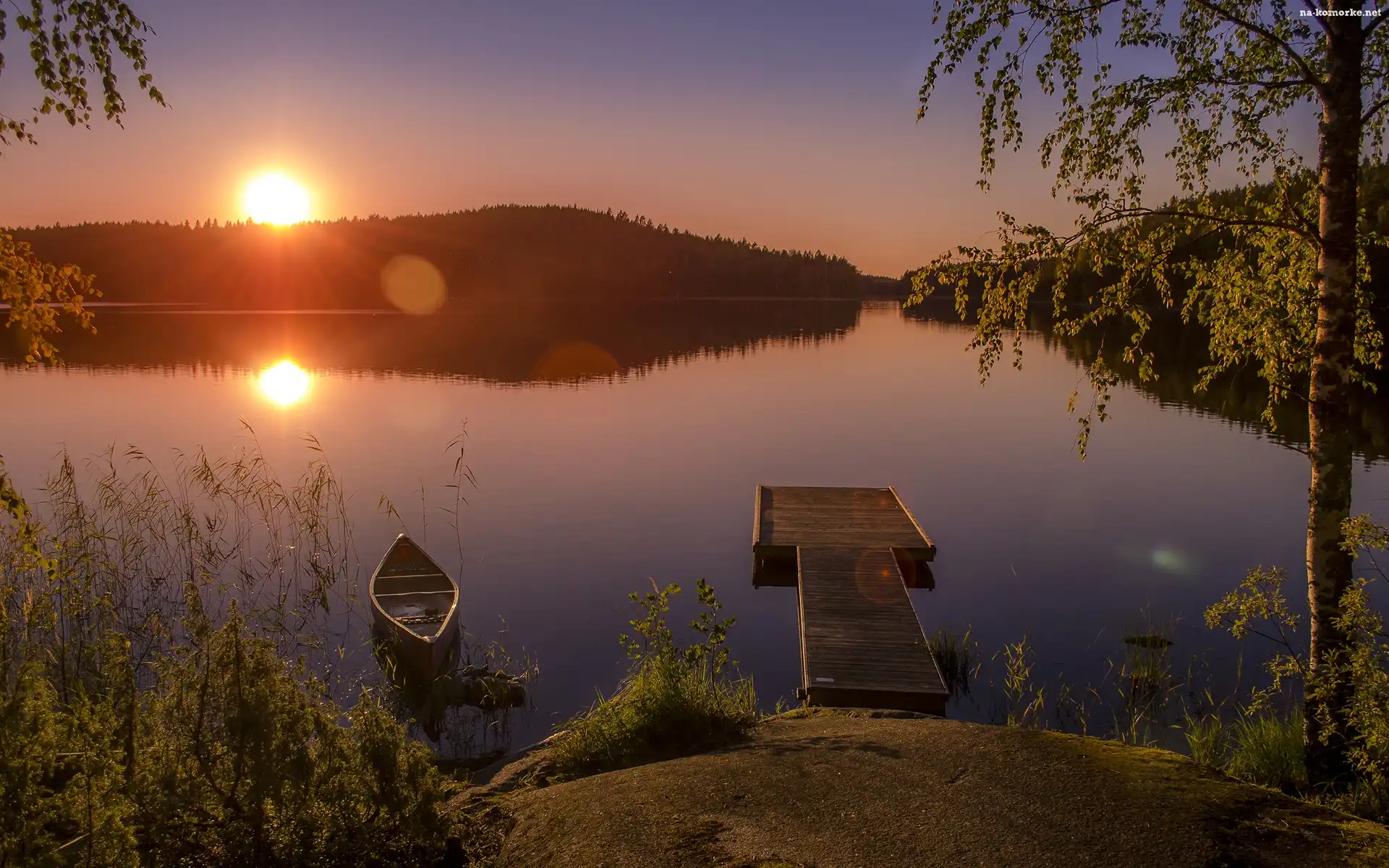 Jezioro, Wschód słońca, Łódka na Komórkę