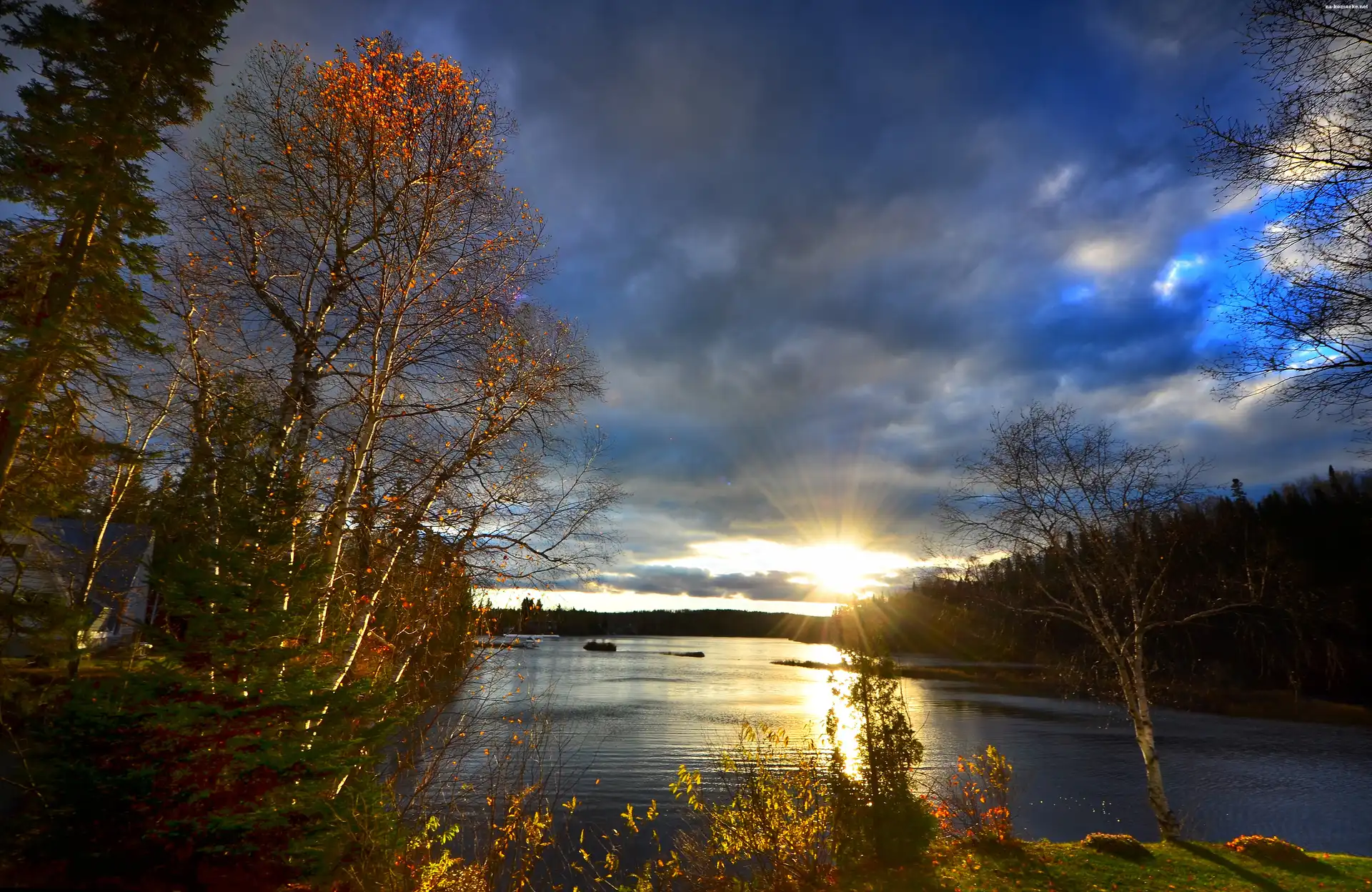 Jezioro, Jesień, Zachód Słońca, Chmury na Komórkę