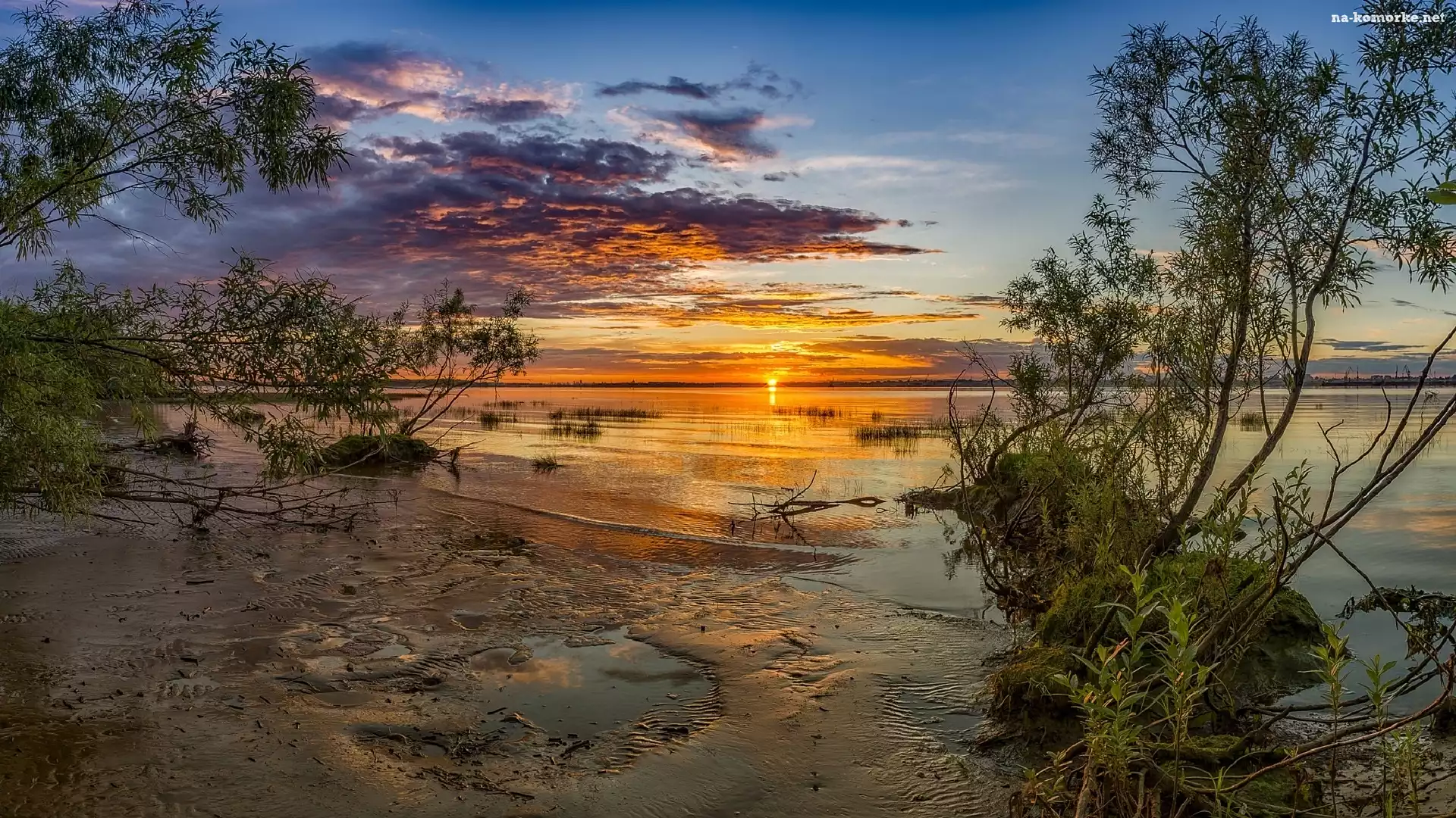 Jezioro, Krzew, Zachód słońca, Drzewa na Komórkę