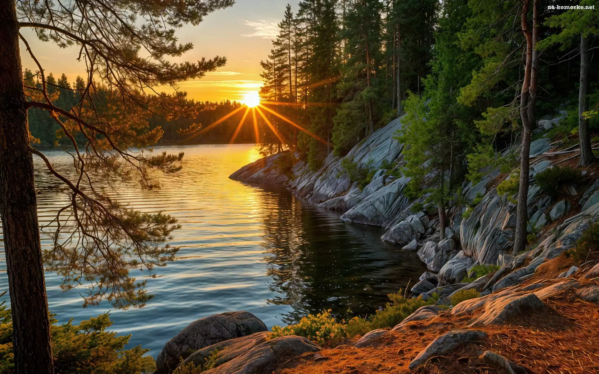 Las, Drzewa, Skały, Jezioro, Zachód słońce na Komórkę