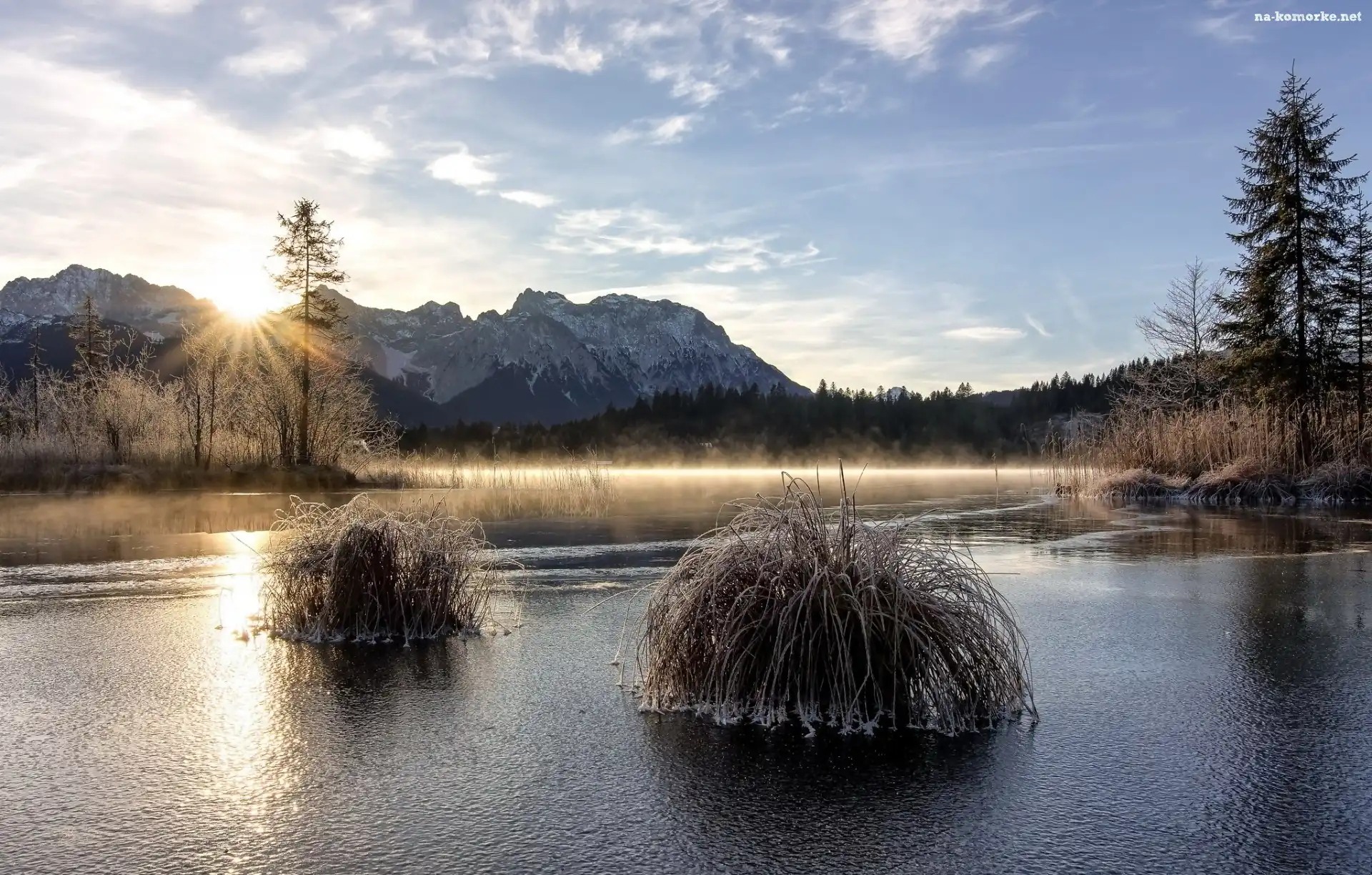 Jezioro, Wschód słońca, Szron, Trawy na Komórkę